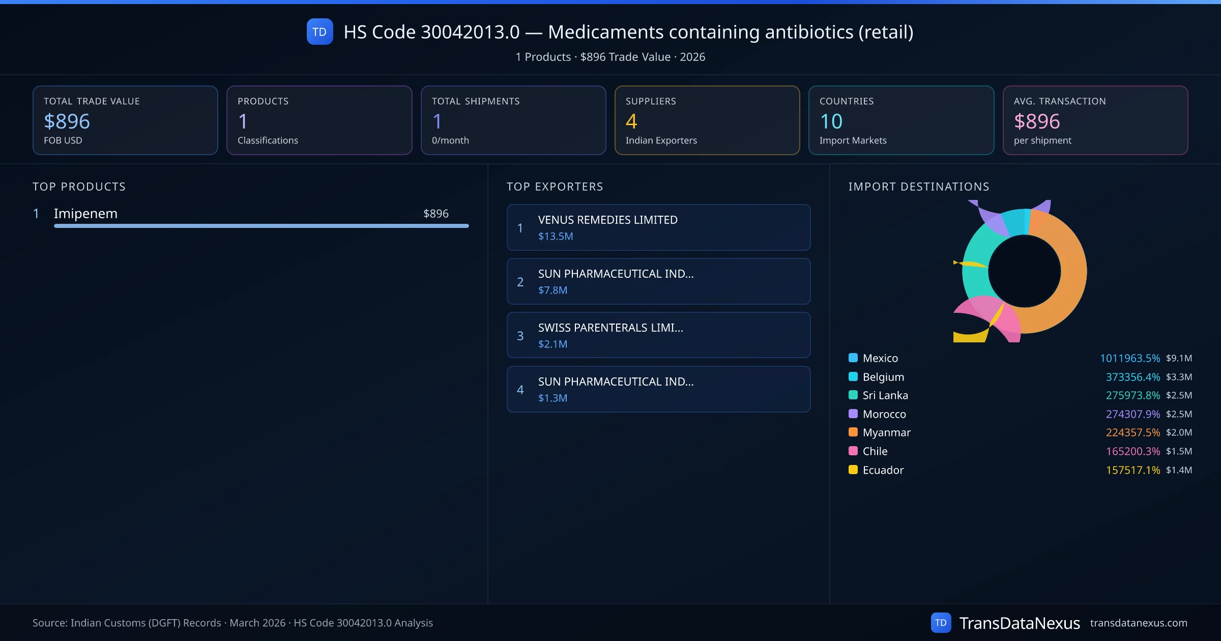 HS Code 30042013.0 (Medicaments containing antibiotics (retail)) is one of India's most significant pharmaceutical export classifications under Chapter 30 of the Harmonized System. With a total trade value of $896 across 1 shipments, this code covers 1 distinct pharmaceutical products exported by 4 Indian manufacturers to 10 countries. The leading product under this classification is Imipenem at $896, followed by .