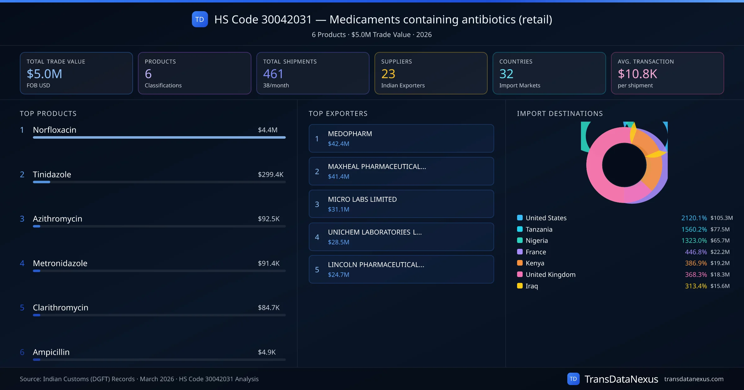 The top importing markets include United States, Tanzania, Nigeria. The top 5 products account for 99.9% of total trade under this code. Average transaction value is $10.8K. Leading exporters include MEDOPHARM and MAXHEAL PHARMACEUTICALS (INDIA) LIMITED. Data sourced from Indian Customs (DGFT) shipping bill records.