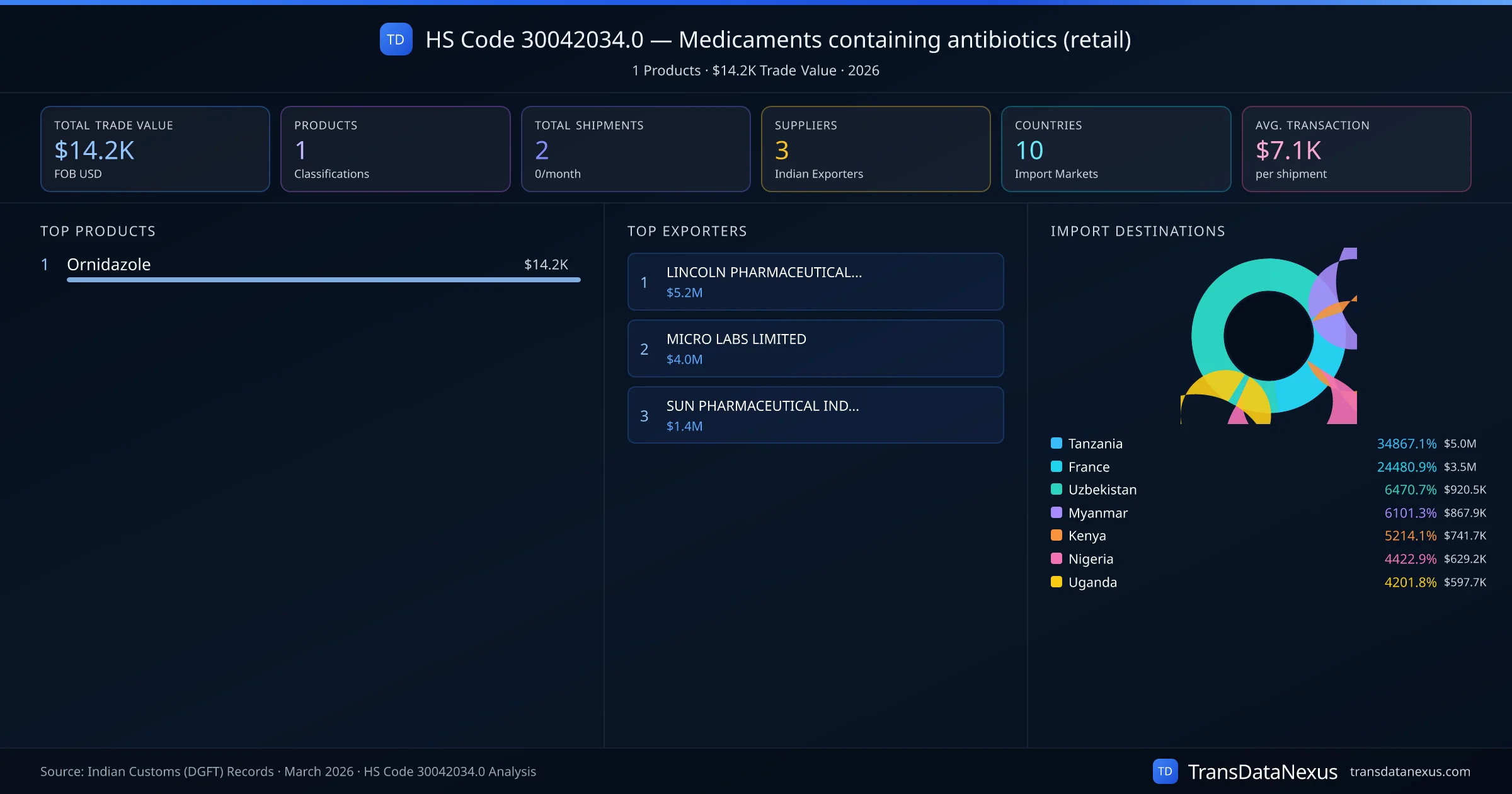 The top importing markets include Tanzania, France, Uzbekistan. The top 5 products account for 100.0% of total trade under this code. Average transaction value is $7.1K. Leading exporters include LINCOLN PHARMACEUTICALS LTD and MICRO LABS LIMITED. Data sourced from Indian Customs (DGFT) shipping bill records.