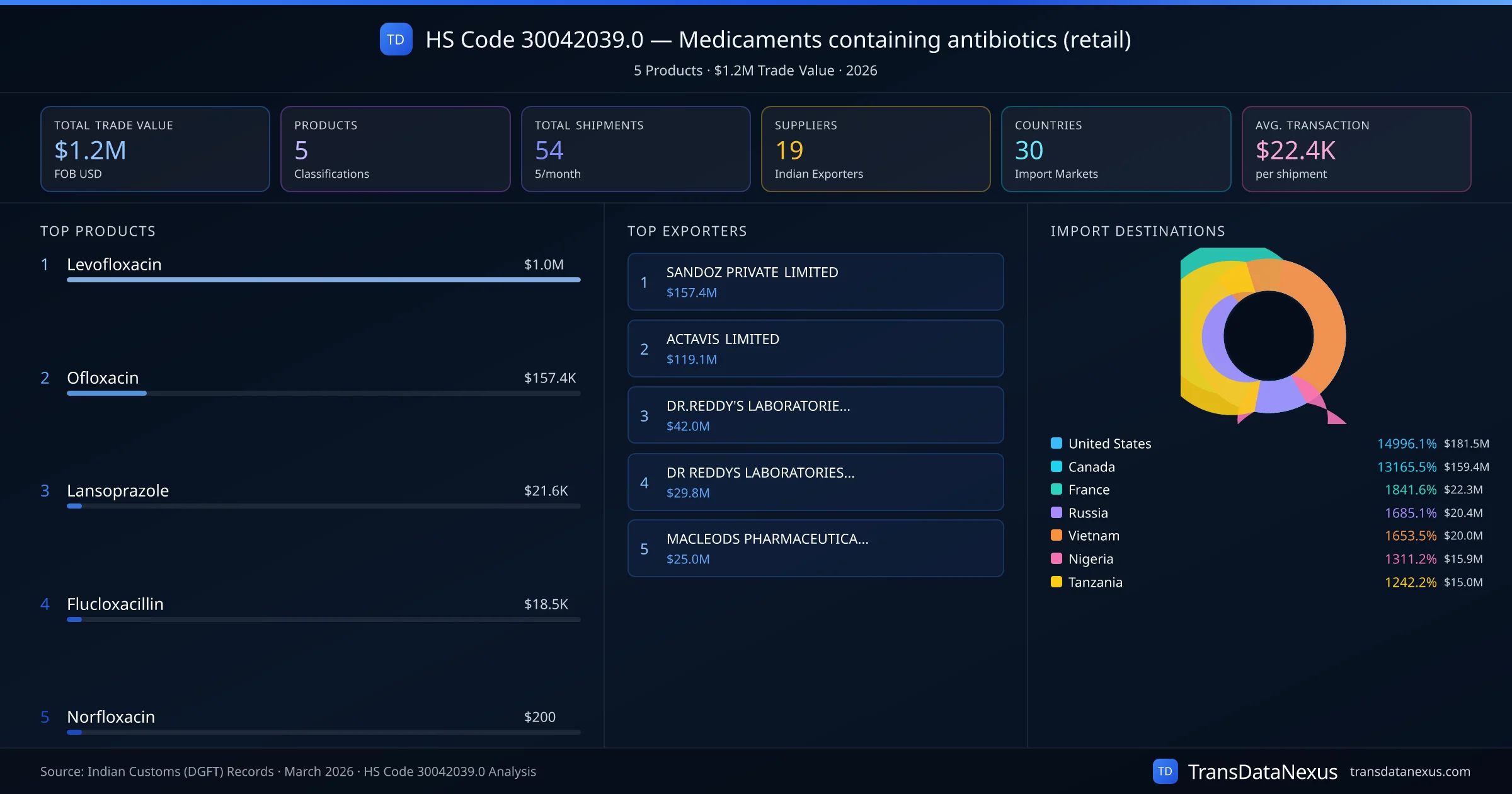 The top importing markets include United States, Canada, France. The top 5 products account for 100.0% of total trade under this code. Average transaction value is $22.4K. Leading exporters include SANDOZ PRIVATE LIMITED and ACTAVIS LIMITED. Data sourced from Indian Customs (DGFT) shipping bill records.