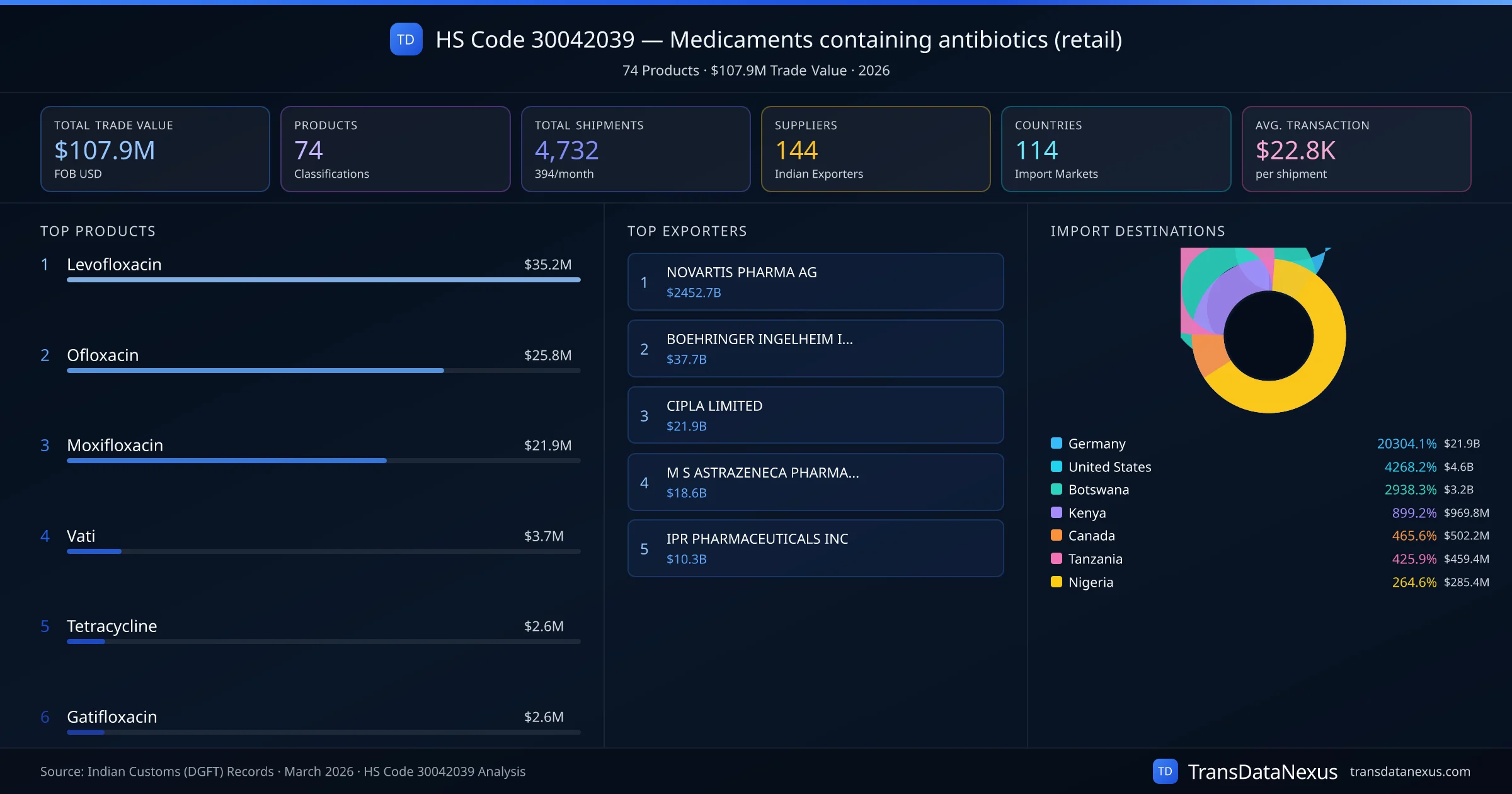 India's total export trade under HS code 30042039 is $107.9M across 4,732 shipments. The average shipment value is $22.8K. The largest product category is Levofloxacin at $35.2M.