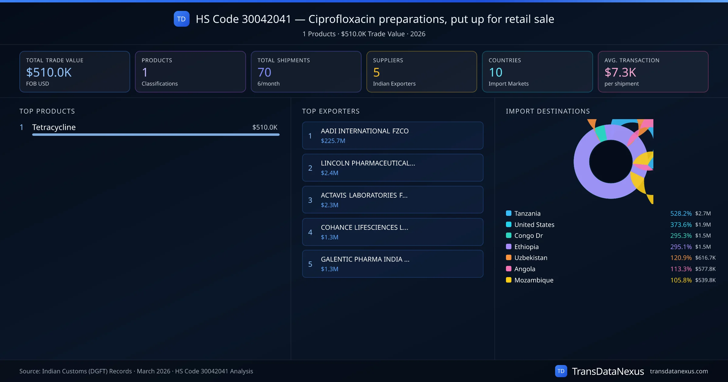 HS Code 30042041 (Ciprofloxacin preparations, put up for retail sale) is one of India's most significant pharmaceutical export classifications under Chapter 30 of the Harmonized System. With a total trade value of $510.0K across 70 shipments, this code covers 1 distinct pharmaceutical products exported by 5 Indian manufacturers to 10 countries. The leading product under this classification is Tetracycline at $510.0K, followed by .