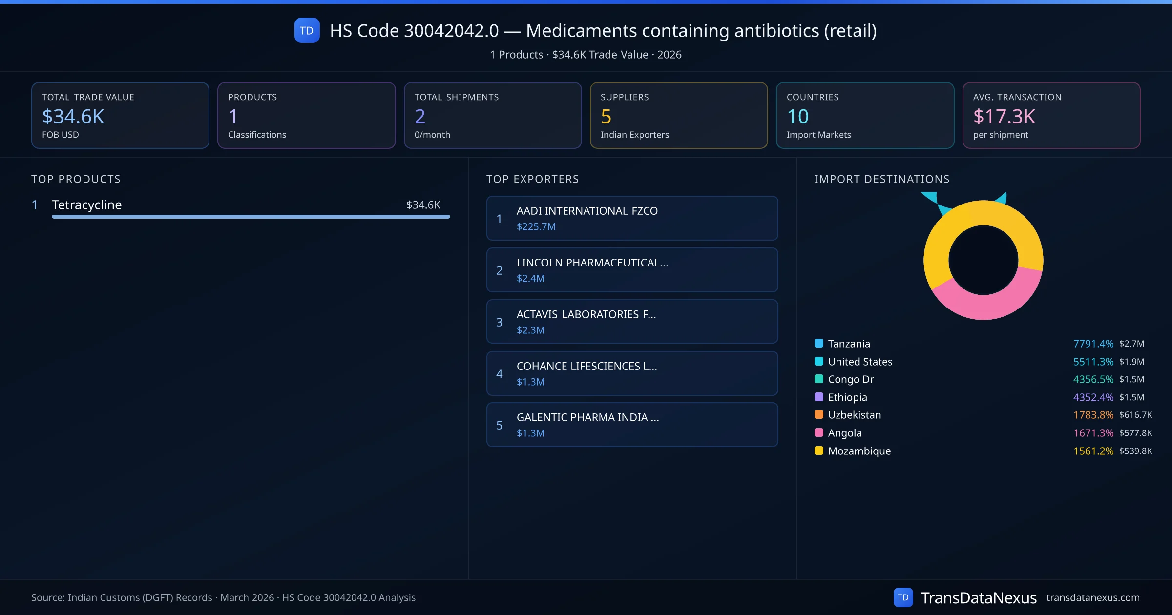 The top importing markets include Tanzania, United States, Congo Dr. The top 5 products account for 100.0% of total trade under this code. Average transaction value is $17.3K. Leading exporters include AADI INTERNATIONAL FZCO and LINCOLN PHARMACEUTICALS LTD. Data sourced from Indian Customs (DGFT) shipping bill records.