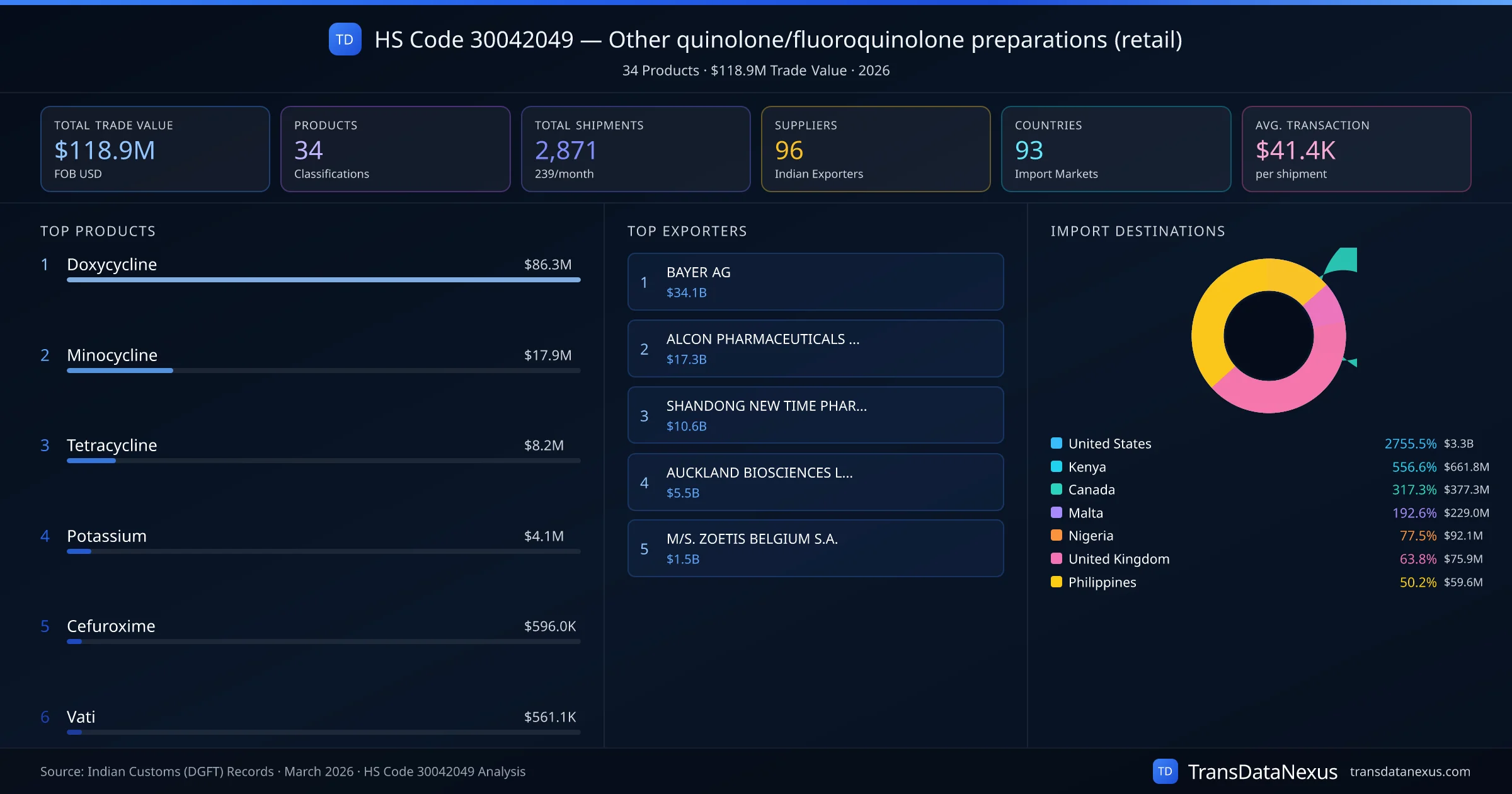 HS Code 30042049 (Other quinolone/fluoroquinolone preparations (retail)) is one of India's most significant pharmaceutical export classifications under Chapter 30 of the Harmonized System. With a total trade value of $118.9M across 2,871 shipments, this code covers 34 distinct pharmaceutical products exported by 96 Indian manufacturers to 93 countries. The leading product under this classification is Doxycycline at $86.3M, followed by Minocycline and Tetracycline.