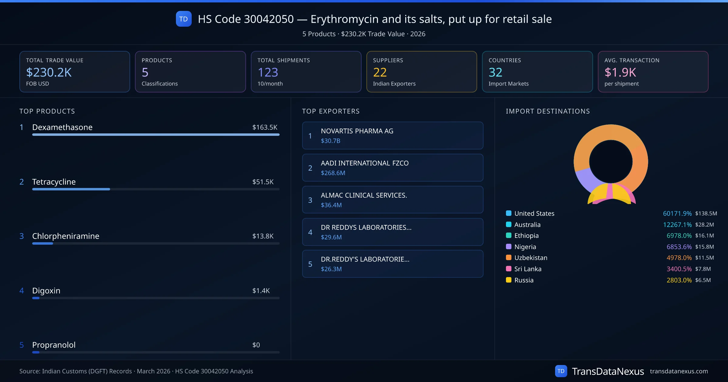 The top importing markets include United States, Australia, Ethiopia. The top 5 products account for 100.0% of total trade under this code. Average transaction value is $1.9K. Leading exporters include NOVARTIS PHARMA AG and AADI INTERNATIONAL FZCO. Data sourced from Indian Customs (DGFT) shipping bill records.