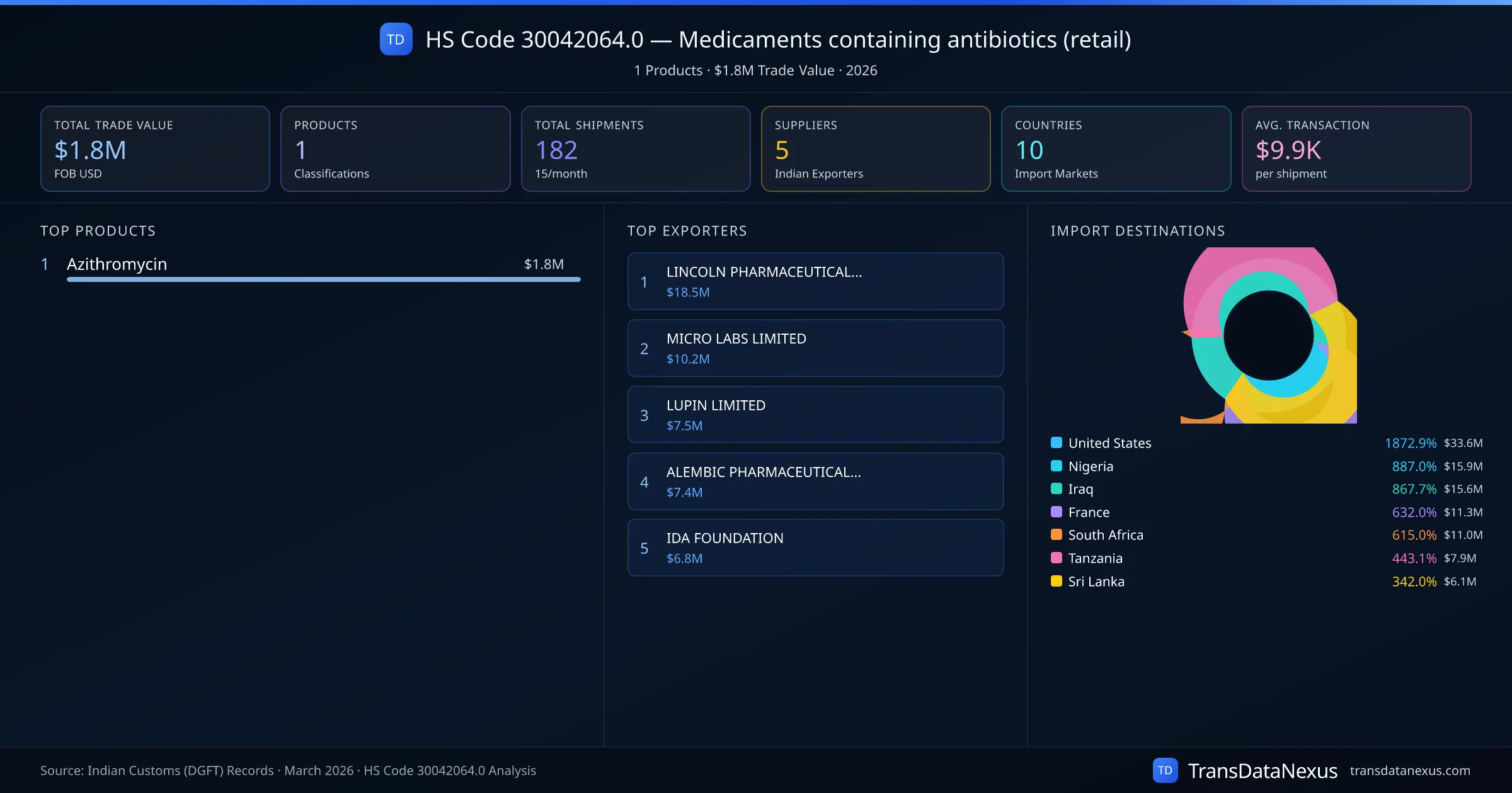 HS Code 30042064.0 (Medicaments containing antibiotics (retail)) is one of India's most significant pharmaceutical export classifications under Chapter 30 of the Harmonized System. With a total trade value of $1.8M across 182 shipments, this code covers 1 distinct pharmaceutical products exported by 5 Indian manufacturers to 10 countries. The leading product under this classification is Azithromycin at $1.8M, followed by .