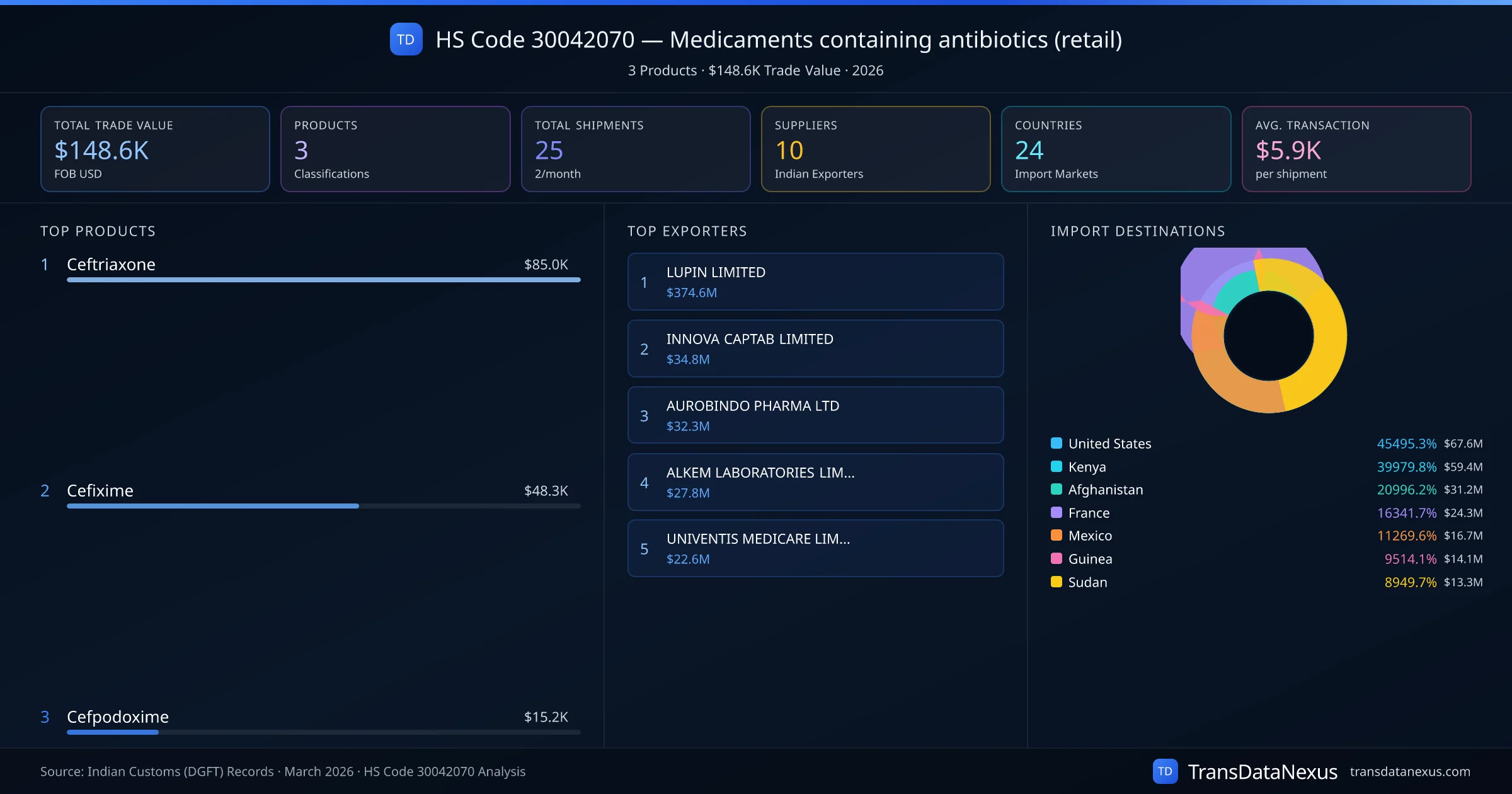 The top importing markets include United States, Kenya, Afghanistan. The top 5 products account for 100.0% of total trade under this code. Average transaction value is $5.9K. Leading exporters include LUPIN LIMITED and INNOVA CAPTAB LIMITED. Data sourced from Indian Customs (DGFT) shipping bill records.