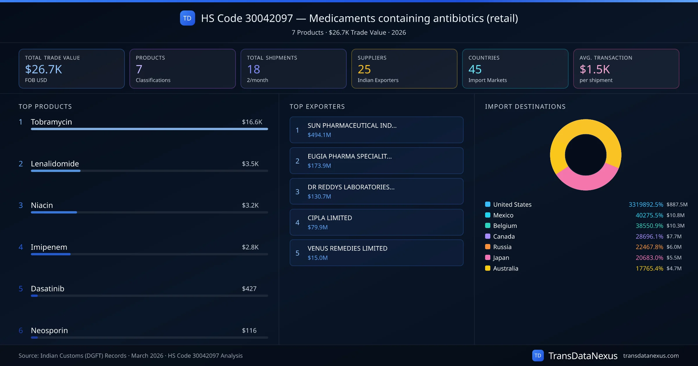 The top importing markets include United States, Mexico, Belgium. The top 5 products account for 99.4% of total trade under this code. Average transaction value is $1.5K. Leading exporters include SUN PHARMACEUTICAL INDUSTRIES LIMITED and EUGIA PHARMA SPECIALITIES LIMITED. Data sourced from Indian Customs (DGFT) shipping bill records.