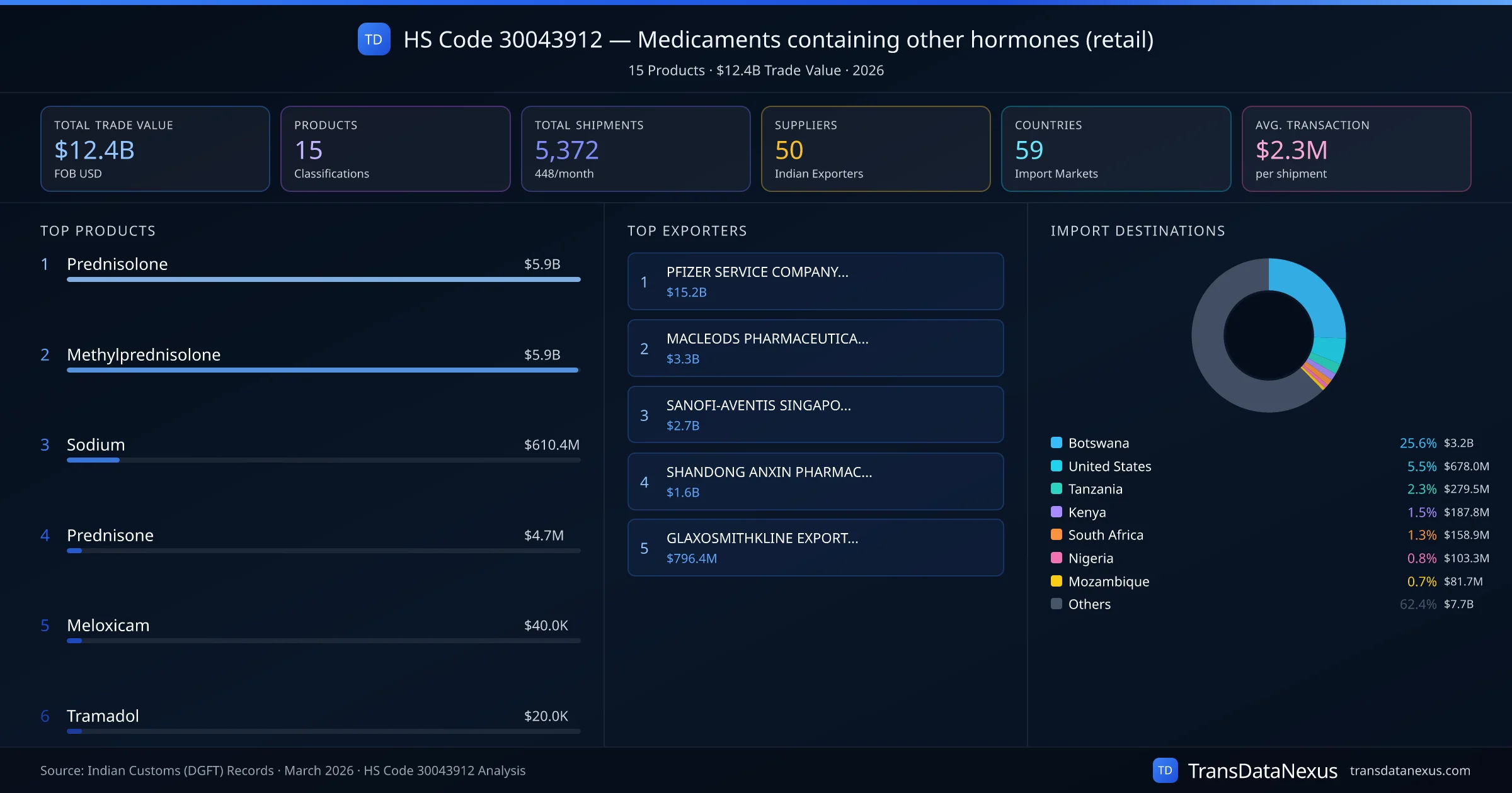 The top importing markets include Botswana, United States, Tanzania. The top 5 products account for 100.0% of total trade under this code. Average transaction value is $2.3M. Leading exporters include PFIZER SERVICE COMPANY BV and MACLEODS PHARMACEUTICALS LTD. Data sourced from Indian Customs (DGFT) shipping bill records.