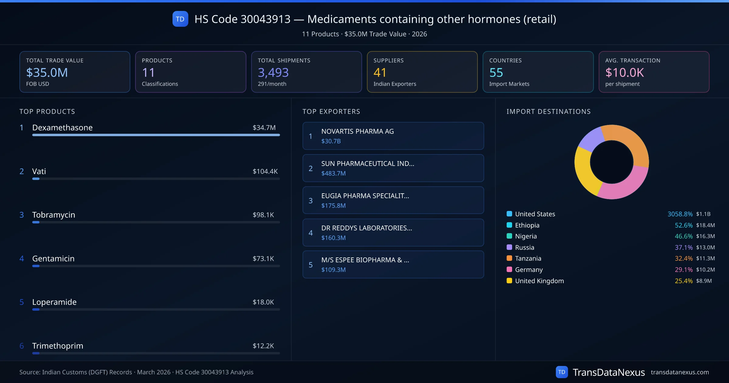 HS Code 30043913 (Medicaments containing other hormones (retail)) is one of India's most significant pharmaceutical export classifications under Chapter 30 of the Harmonized System. With a total trade value of $35.0M across 3,493 shipments, this code covers 11 distinct pharmaceutical products exported by 41 Indian manufacturers to 55 countries. The leading product under this classification is Dexamethasone at $34.7M, followed by Vati and Tobramycin.