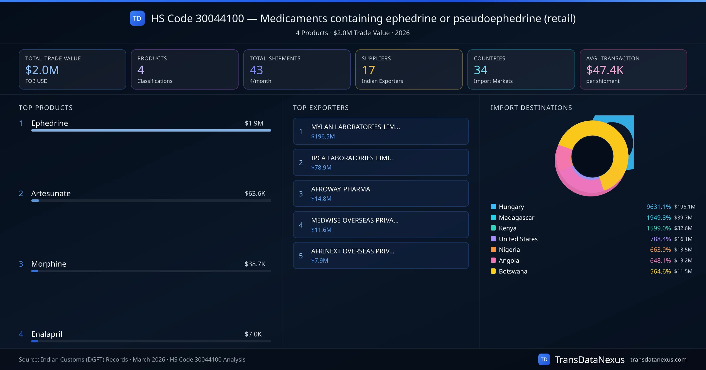 HS Code 30044100 (Medicaments containing ephedrine or pseudoephedrine (retail)) is one of India's most significant pharmaceutical export classifications under Chapter 30 of the Harmonized System. With a total trade value of $2.0M across 43 shipments, this code covers 4 distinct pharmaceutical products exported by 17 Indian manufacturers to 34 countries. The leading product under this classification is Ephedrine at $1.9M, followed by Artesunate and Morphine.