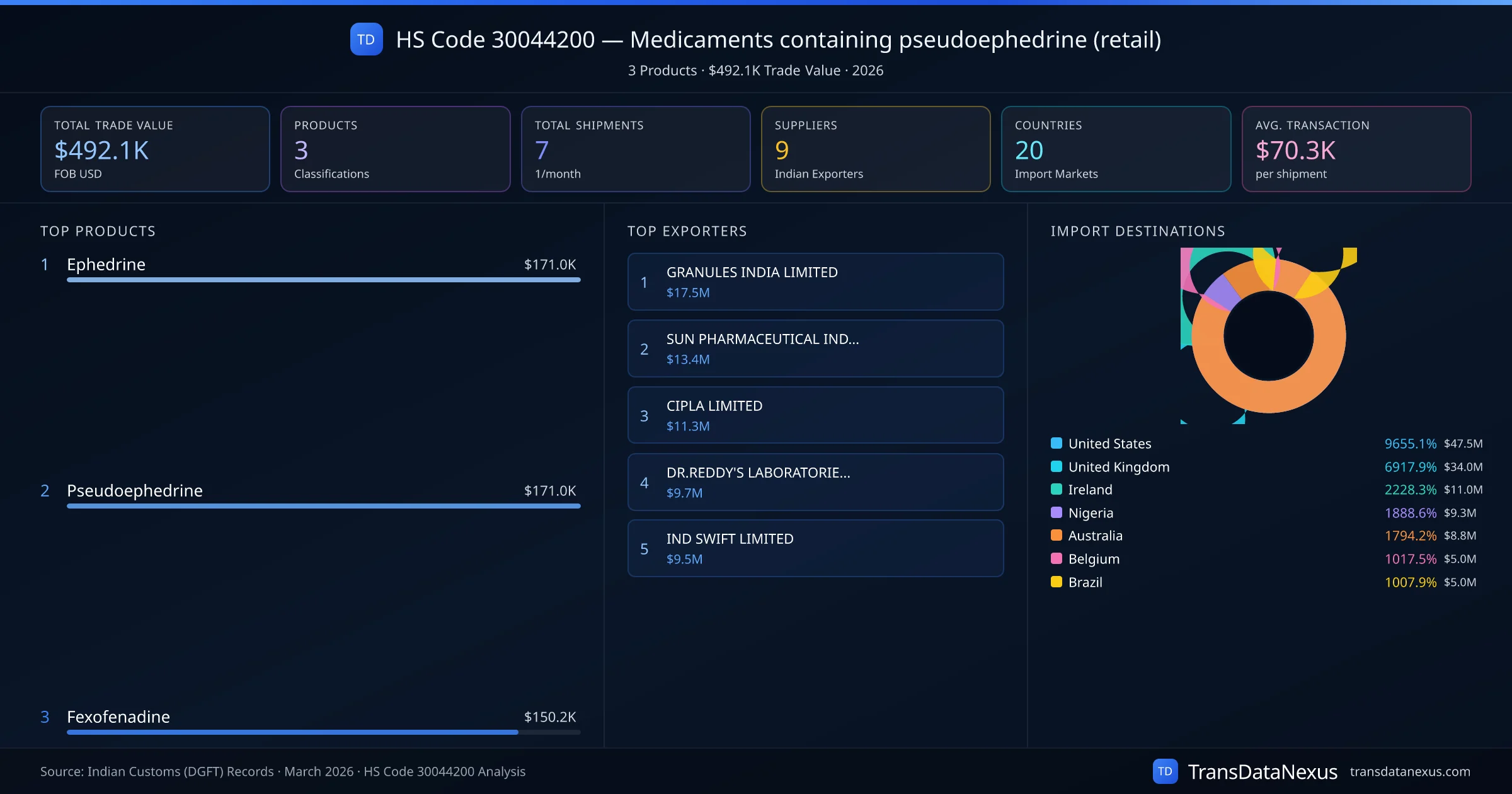 HS Code 30044200 (Medicaments containing pseudoephedrine (retail)) is one of India's most significant pharmaceutical export classifications under Chapter 30 of the Harmonized System. With a total trade value of $492.1K across 7 shipments, this code covers 3 distinct pharmaceutical products exported by 9 Indian manufacturers to 20 countries. The leading product under this classification is Ephedrine at $171.0K, followed by Pseudoephedrine and Fexofenadine.