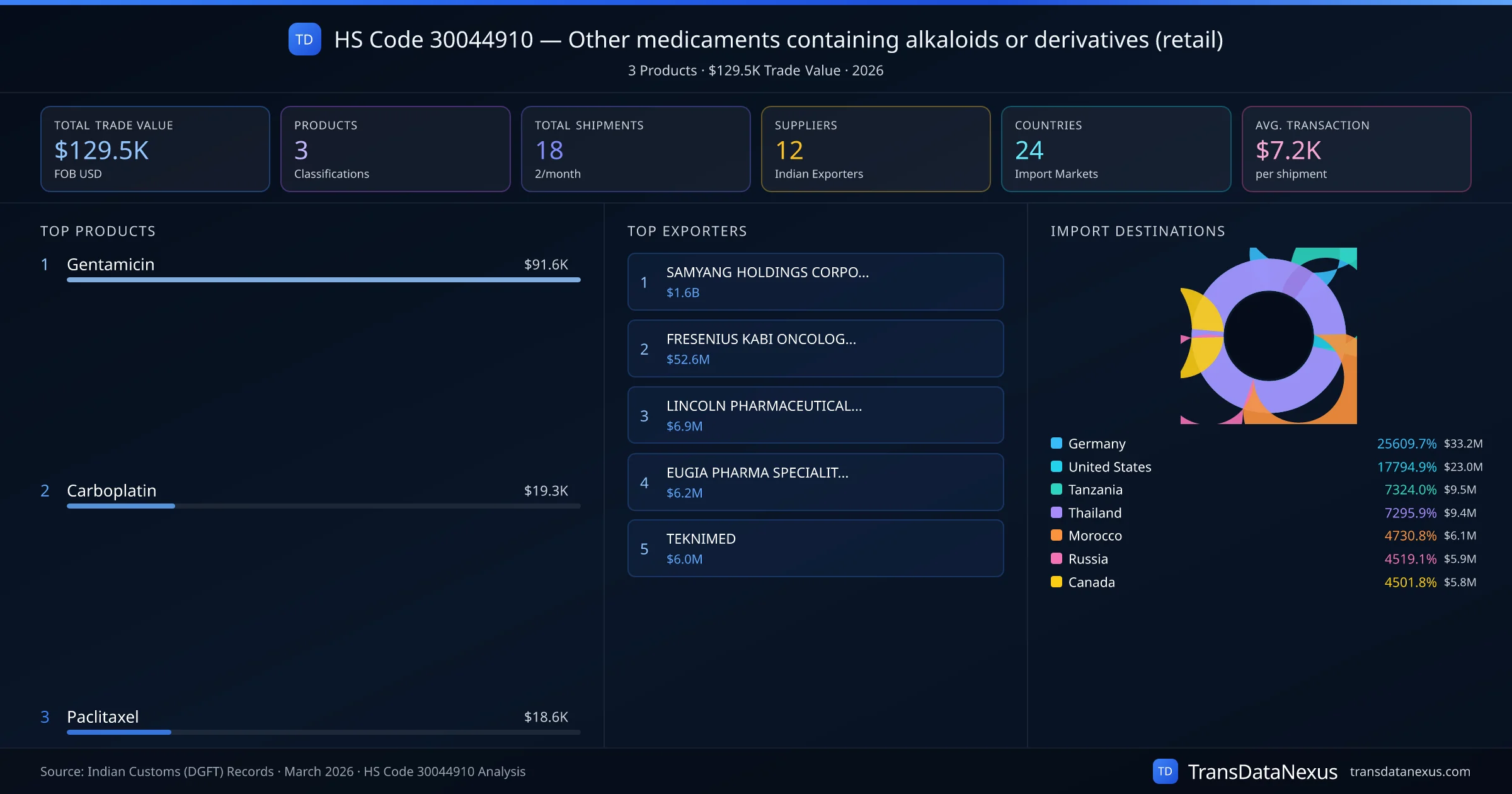 HS Code 30044910 (Other medicaments containing alkaloids or derivatives (retail)) is one of India's most significant pharmaceutical export classifications under Chapter 30 of the Harmonized System. With a total trade value of $129.5K across 18 shipments, this code covers 3 distinct pharmaceutical products exported by 12 Indian manufacturers to 24 countries. The leading product under this classification is Gentamicin at $91.6K, followed by Carboplatin and Paclitaxel.