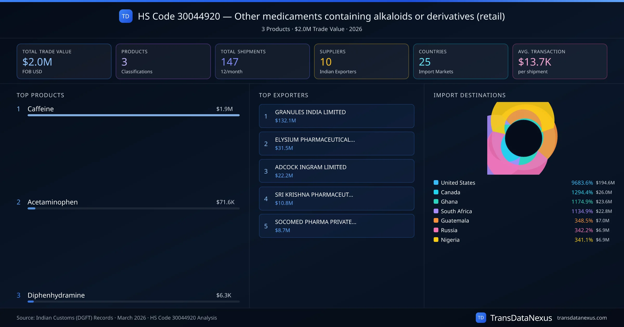 HS Code 30044920 (Other medicaments containing alkaloids or derivatives (retail)) is one of India's most significant pharmaceutical export classifications under Chapter 30 of the Harmonized System. With a total trade value of $2.0M across 147 shipments, this code covers 3 distinct pharmaceutical products exported by 10 Indian manufacturers to 25 countries. The leading product under this classification is Caffeine at $1.9M, followed by Acetaminophen and Diphenhydramine.