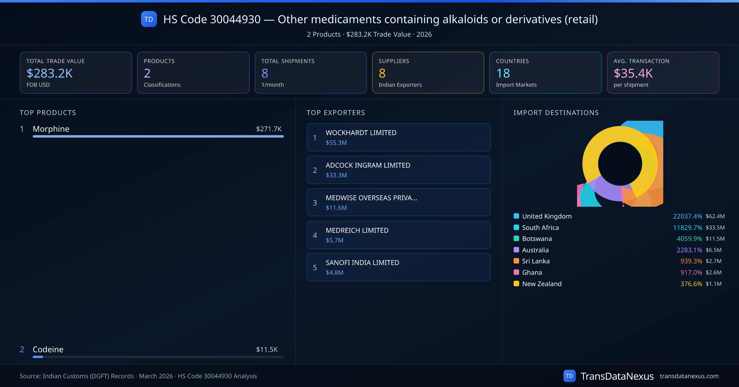 The top importing markets include United Kingdom, South Africa, Botswana. The top 5 products account for 100.0% of total trade under this code. Average transaction value is $35.4K. Leading exporters include WOCKHARDT LIMITED and ADCOCK INGRAM LIMITED. Data sourced from Indian Customs (DGFT) shipping bill records.