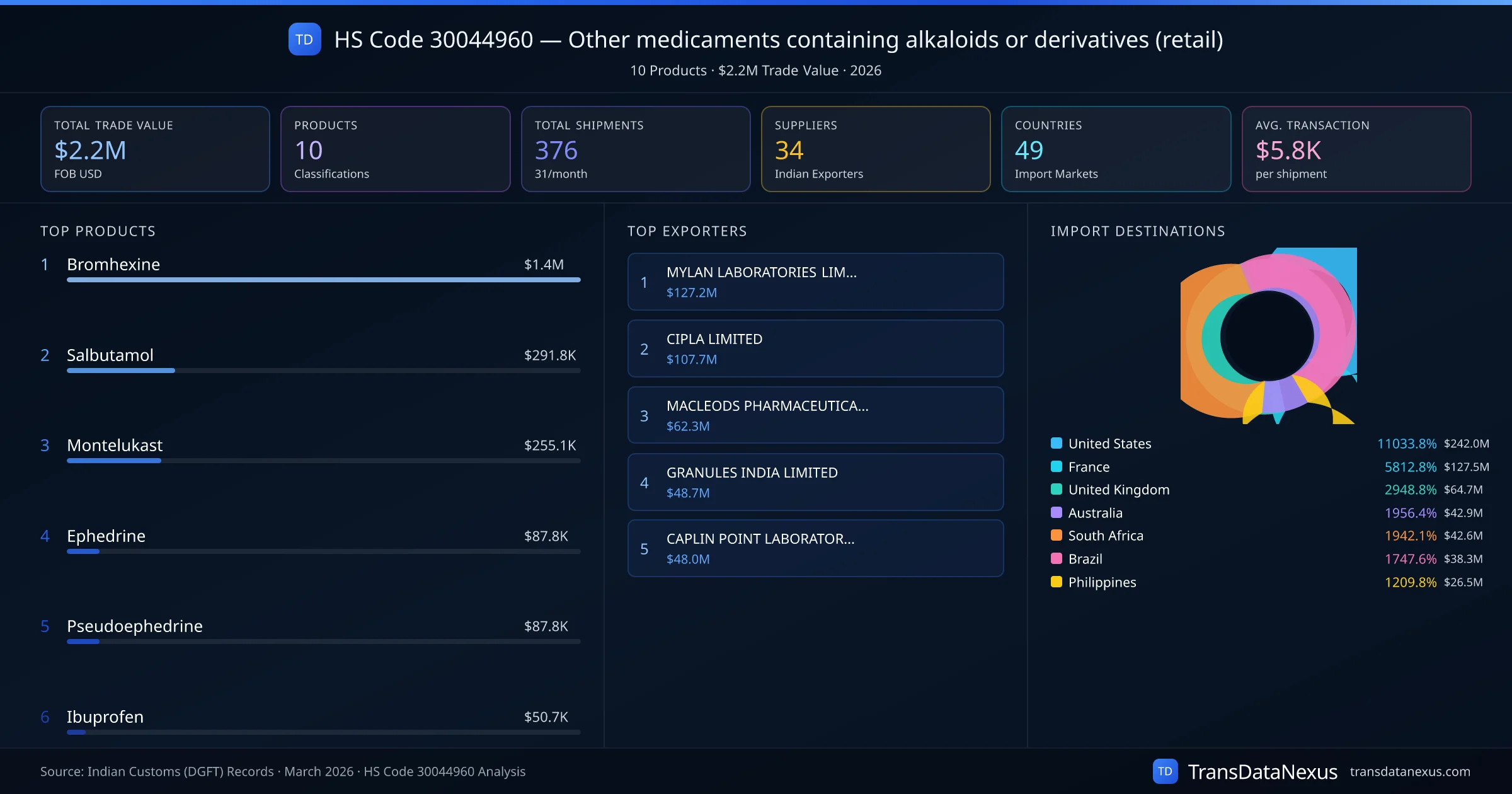HS Code 30044960 (Other medicaments containing alkaloids or derivatives (retail)) is one of India's most significant pharmaceutical export classifications under Chapter 30 of the Harmonized System. With a total trade value of $2.2M across 376 shipments, this code covers 10 distinct pharmaceutical products exported by 34 Indian manufacturers to 49 countries. The leading product under this classification is Bromhexine at $1.4M, followed by Salbutamol and Montelukast.