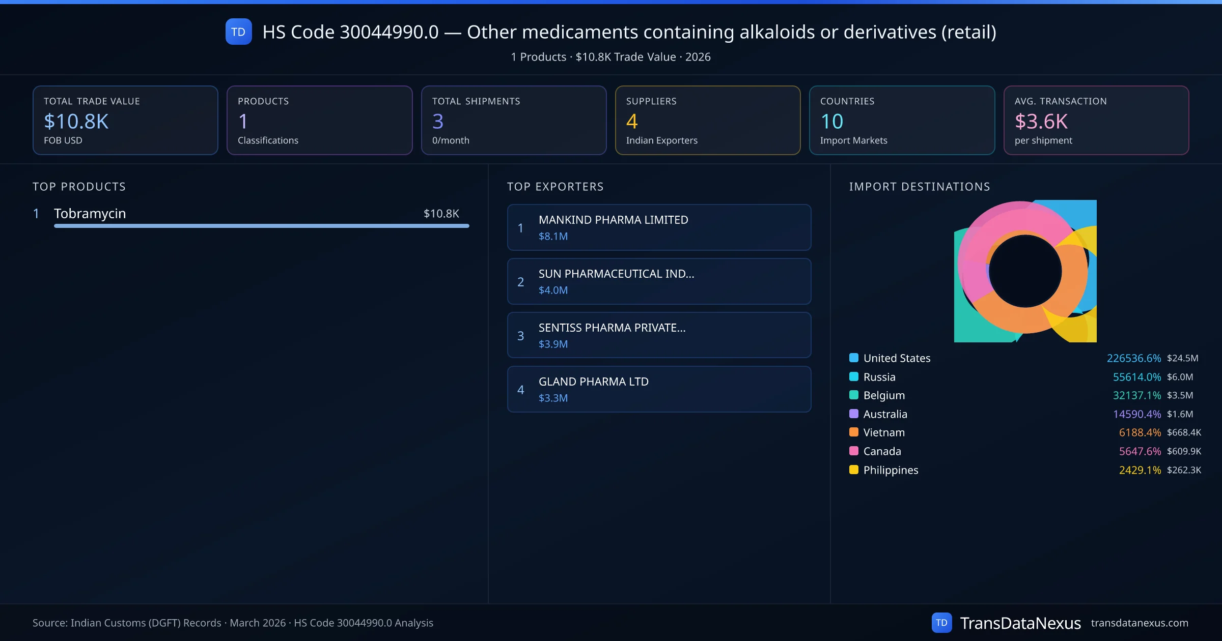 HS Code 30044990.0 (Other medicaments containing alkaloids or derivatives (retail)) is one of India's most significant pharmaceutical export classifications under Chapter 30 of the Harmonized System. With a total trade value of $10.8K across 3 shipments, this code covers 1 distinct pharmaceutical products exported by 4 Indian manufacturers to 10 countries. The leading product under this classification is Tobramycin at $10.8K, followed by .