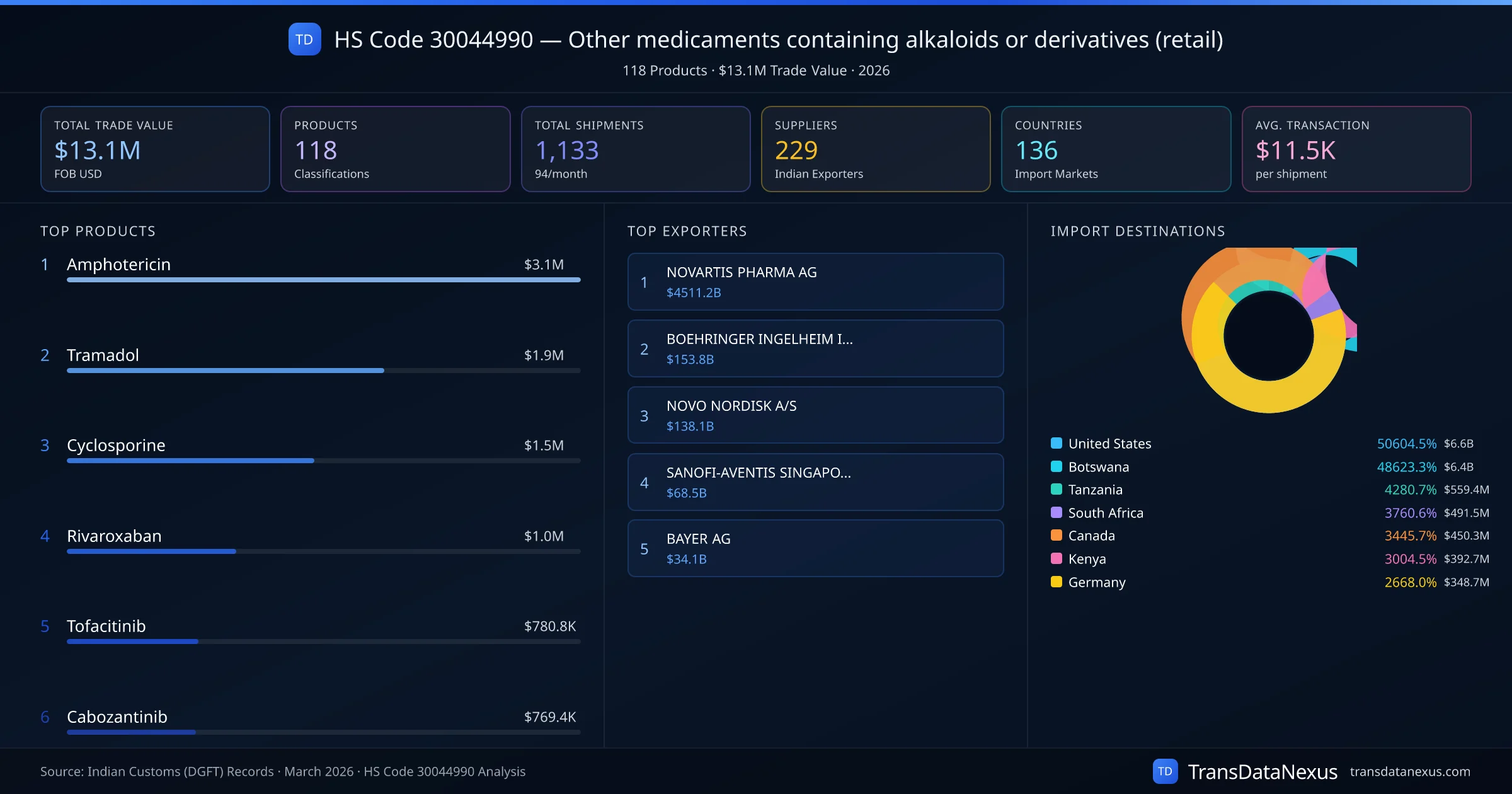 HS Code 30044990 (Other medicaments containing alkaloids or derivatives (retail)) is one of India's most significant pharmaceutical export classifications under Chapter 30 of the Harmonized System. With a total trade value of $13.1M across 1,133 shipments, this code covers 118 distinct pharmaceutical products exported by 229 Indian manufacturers to 136 countries. The leading product under this classification is Amphotericin at $3.1M, followed by Tramadol and Cyclosporine.