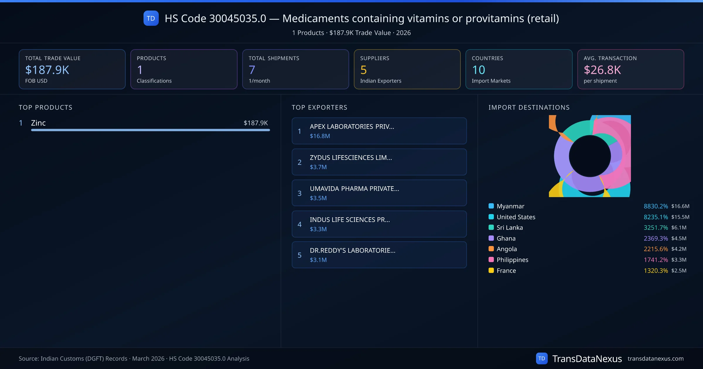 HS Code 30045035.0 (Medicaments containing vitamins or provitamins (retail)) is one of India's most significant pharmaceutical export classifications under Chapter 30 of the Harmonized System. With a total trade value of $187.9K across 7 shipments, this code covers 1 distinct pharmaceutical products exported by 5 Indian manufacturers to 10 countries. The leading product under this classification is Zinc at $187.9K, followed by .