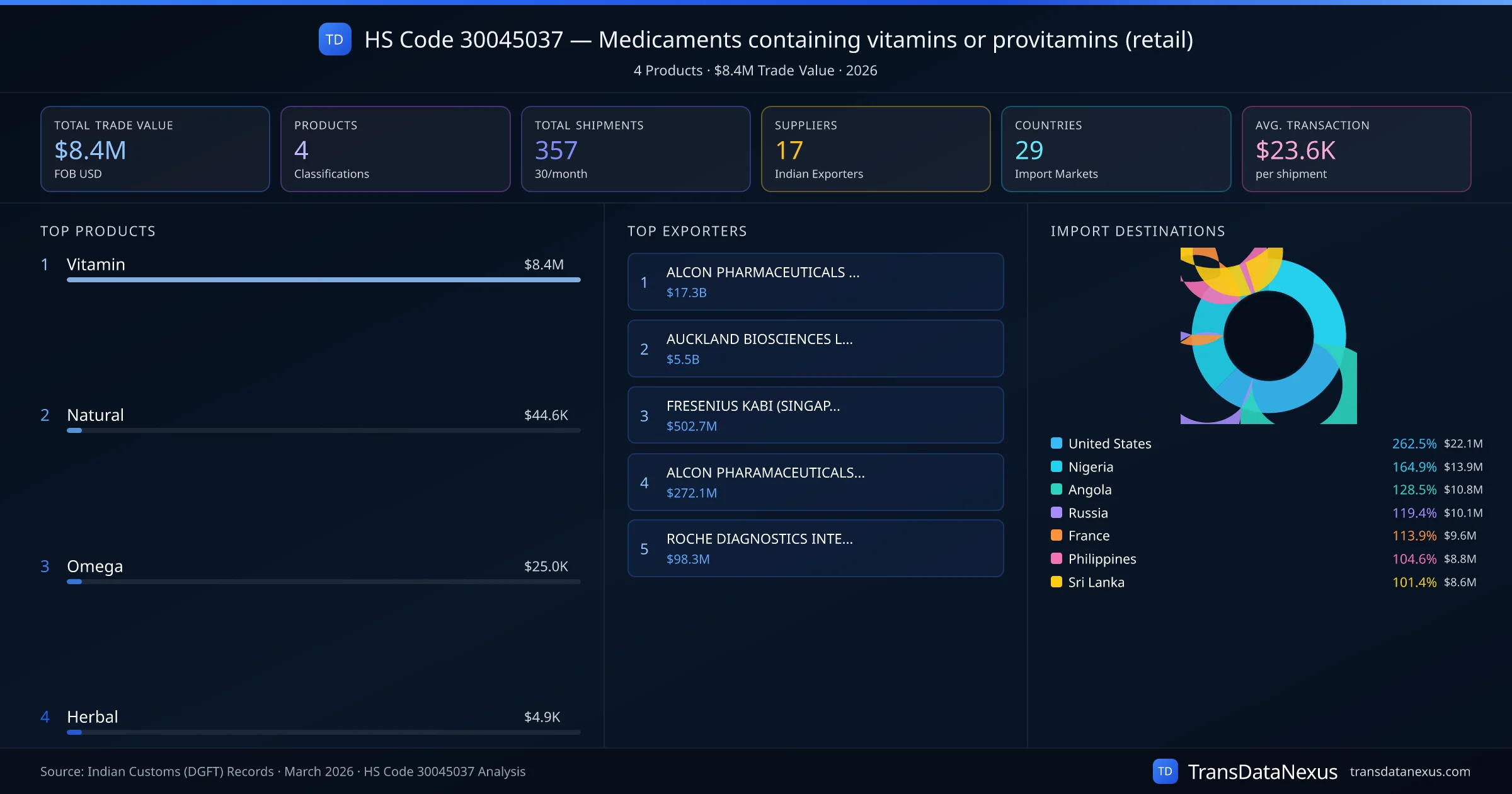 HS Code 30045037 (Medicaments containing vitamins or provitamins (retail)) is one of India's most significant pharmaceutical export classifications under Chapter 30 of the Harmonized System. With a total trade value of $8.4M across 357 shipments, this code covers 4 distinct pharmaceutical products exported by 17 Indian manufacturers to 29 countries. The leading product under this classification is Vitamin at $8.4M, followed by Natural and Omega.