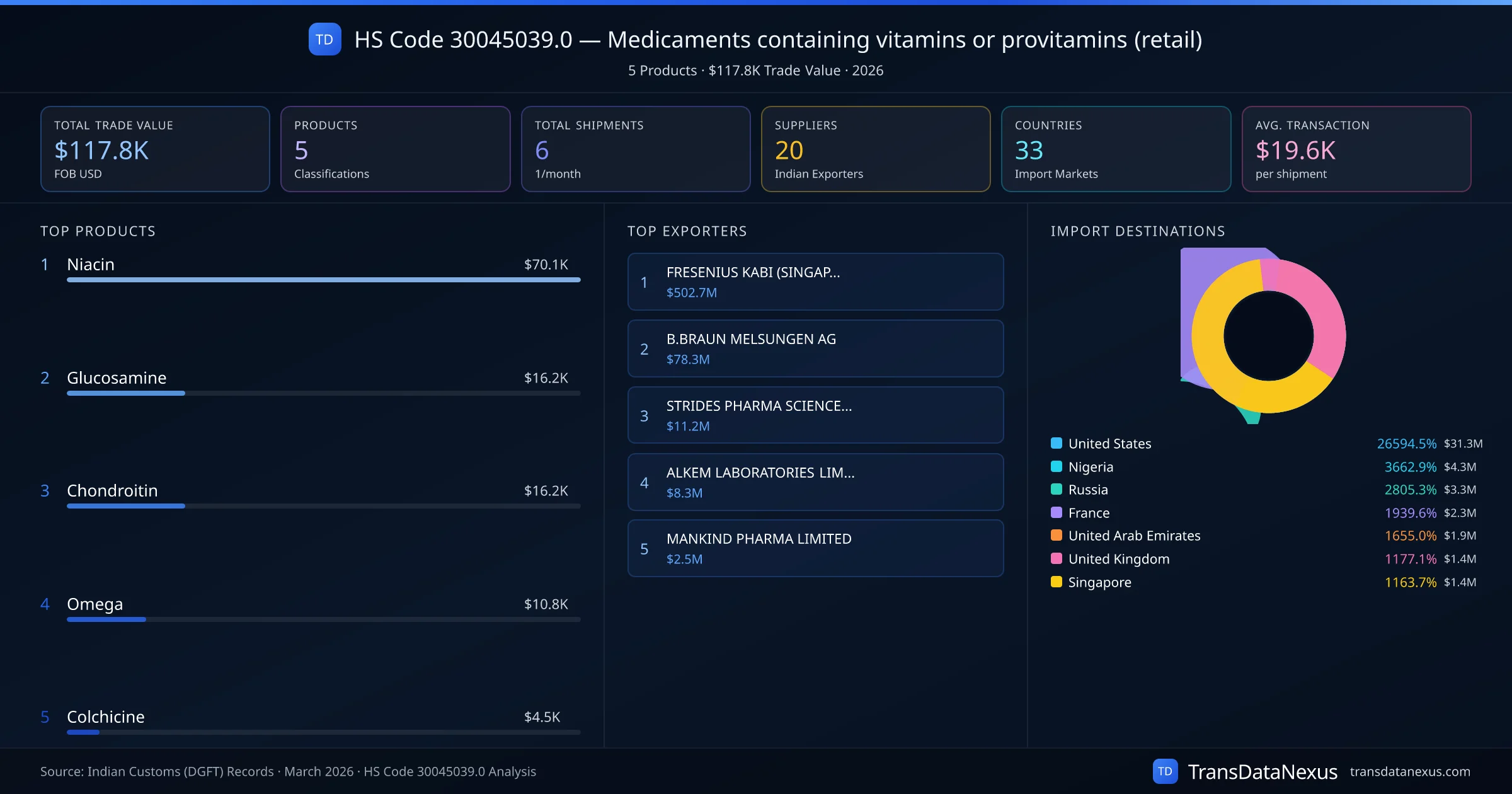 HS Code 30045039.0 (Medicaments containing vitamins or provitamins (retail)) is one of India's most significant pharmaceutical export classifications under Chapter 30 of the Harmonized System. With a total trade value of $117.8K across 6 shipments, this code covers 5 distinct pharmaceutical products exported by 20 Indian manufacturers to 33 countries. The leading product under this classification is Niacin at $70.1K, followed by Glucosamine and Chondroitin.