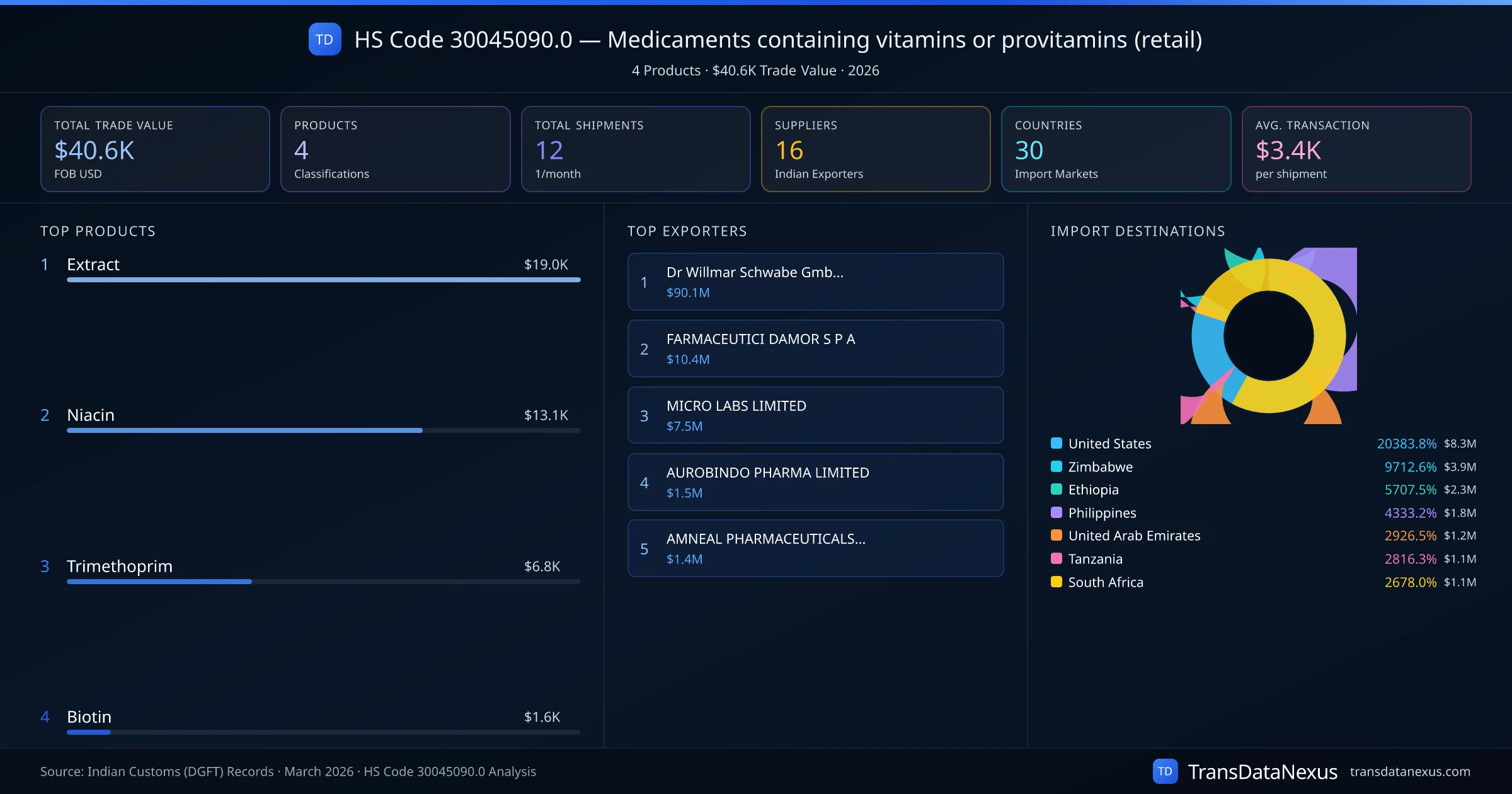 HS Code 30045090.0 (Medicaments containing vitamins or provitamins (retail)) is one of India's most significant pharmaceutical export classifications under Chapter 30 of the Harmonized System. With a total trade value of $40.6K across 12 shipments, this code covers 4 distinct pharmaceutical products exported by 16 Indian manufacturers to 30 countries. The leading product under this classification is Extract at $19.0K, followed by Niacin and Trimethoprim.