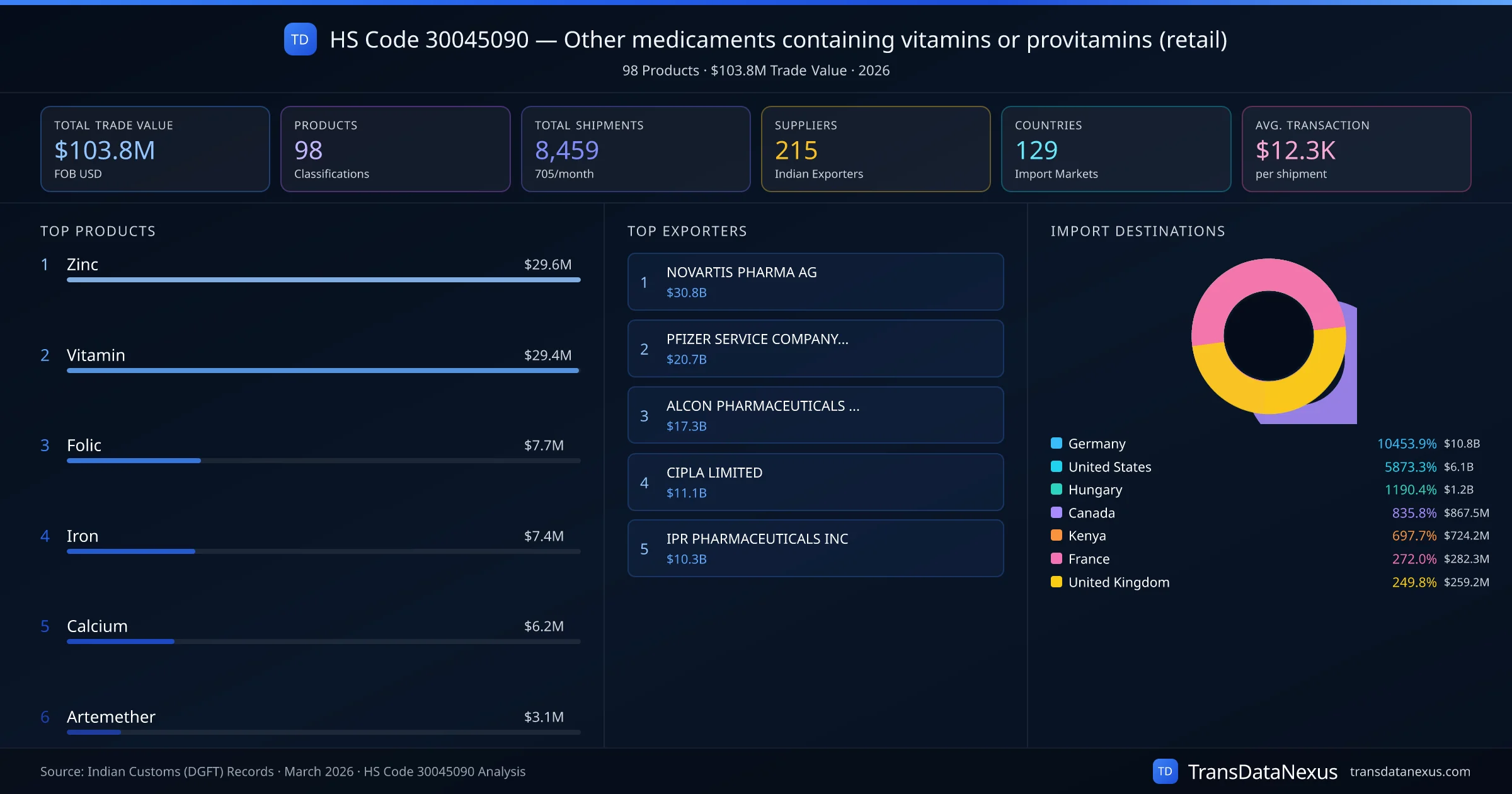 HS Code 30045090 (Other medicaments containing vitamins or provitamins (retail)) is one of India's most significant pharmaceutical export classifications under Chapter 30 of the Harmonized System. With a total trade value of $103.8M across 8,459 shipments, this code covers 98 distinct pharmaceutical products exported by 215 Indian manufacturers to 129 countries. The leading product under this classification is Zinc at $29.6M, followed by Vitamin and Folic.
