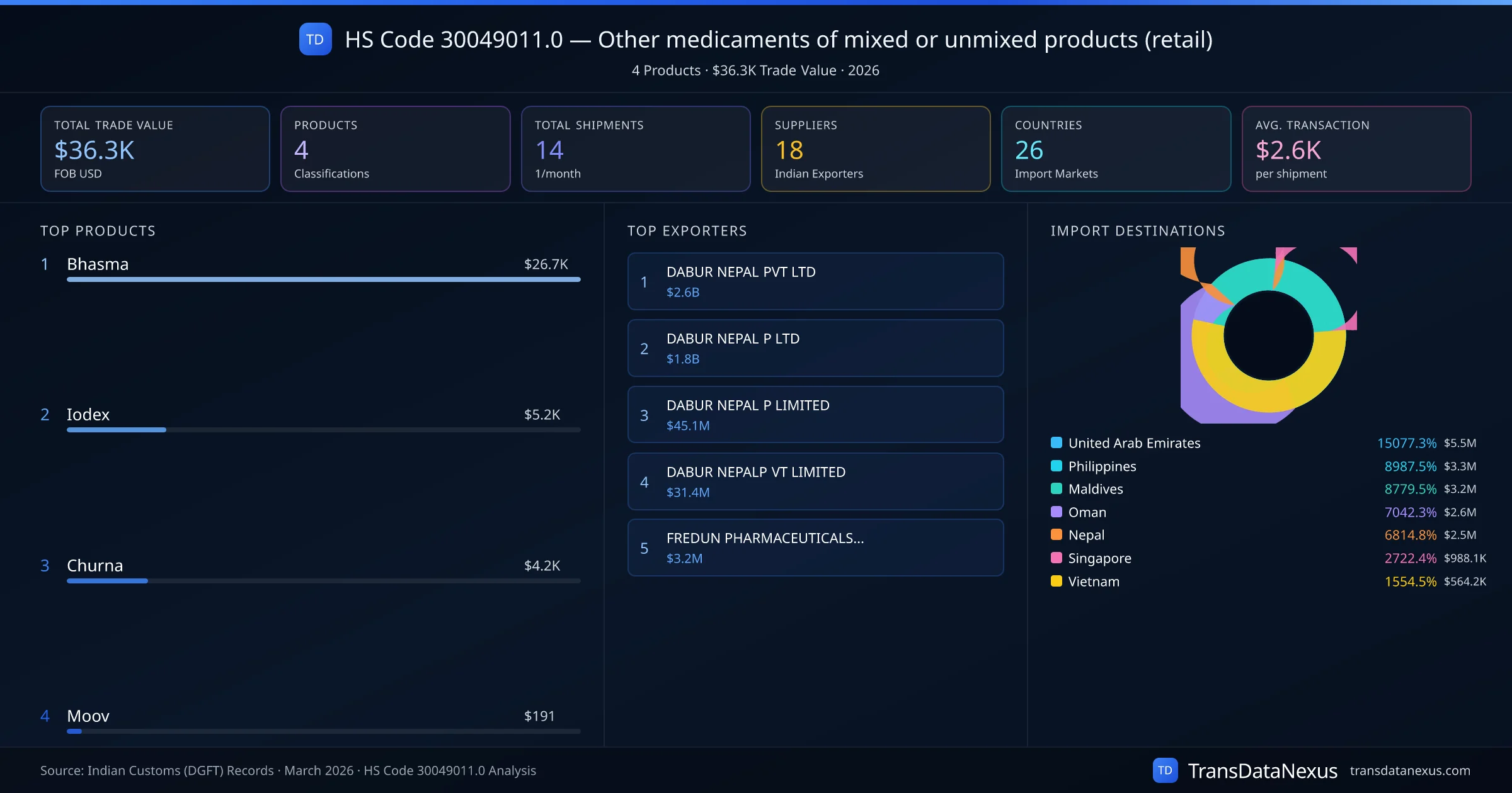 The top importing markets include United Arab Emirates, Philippines, Maldives. The top 5 products account for 100.0% of total trade under this code. Average transaction value is $2.6K. Leading exporters include DABUR NEPAL PVT LTD and DABUR NEPAL P LTD. Data sourced from Indian Customs (DGFT) shipping bill records.