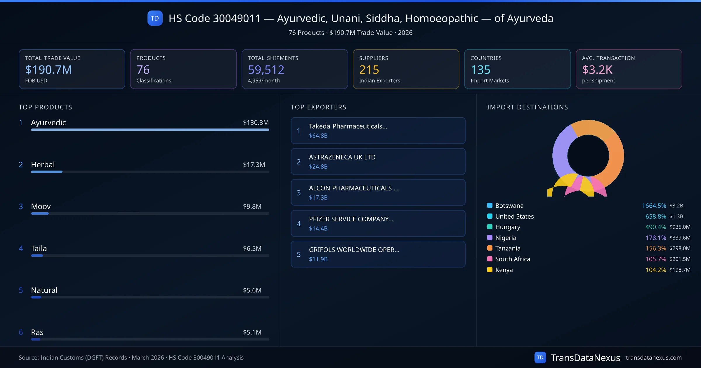 HS Code 30049011 (Ayurvedic, Unani, Siddha, Homoeopathic โ of Ayurveda) is one of India's most significant pharmaceutical export classifications under Chapter 30 of the Harmonized System. With a total trade value of $190.7M across 59,512 shipments, this code covers 76 distinct pharmaceutical products exported by 215 Indian manufacturers to 135 countries. The leading product under this classification is Ayurvedic at $130.3M, followed by Herbal and Moov.