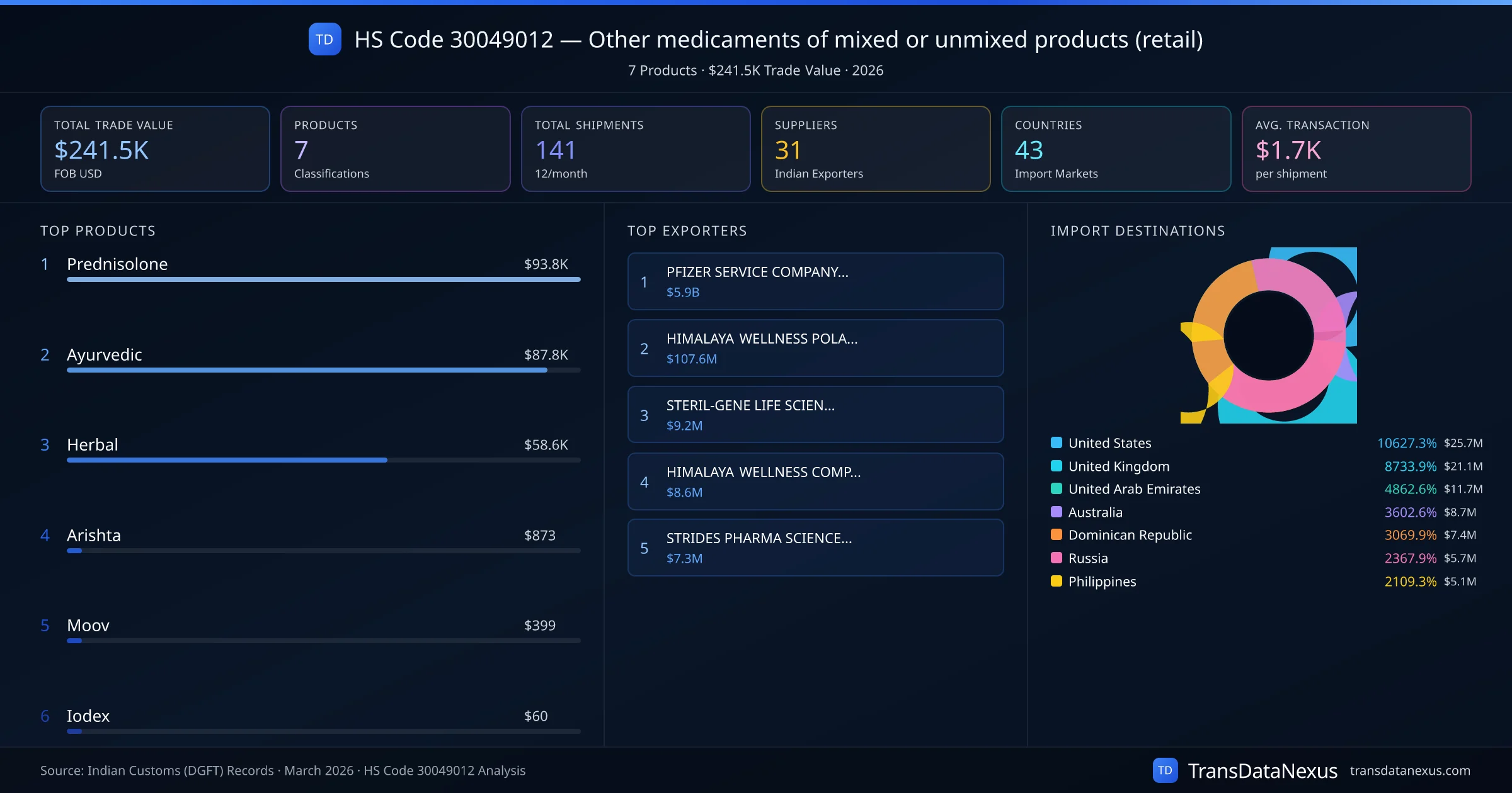 HS Code 30049012 (Other medicaments of mixed or unmixed products (retail)) is one of India's most significant pharmaceutical export classifications under Chapter 30 of the Harmonized System. With a total trade value of $241.5K across 141 shipments, this code covers 7 distinct pharmaceutical products exported by 31 Indian manufacturers to 43 countries. The leading product under this classification is Prednisolone at $93.8K, followed by Ayurvedic and Herbal.