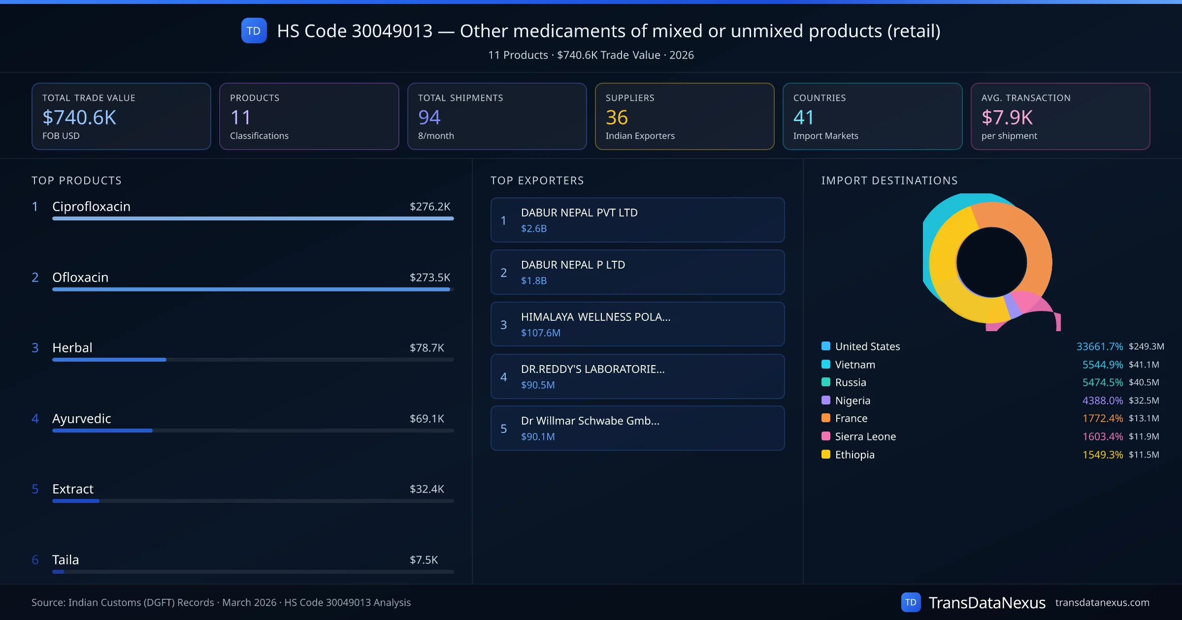 HS Code 30049013 (Other medicaments of mixed or unmixed products (retail)) is one of India's most significant pharmaceutical export classifications under Chapter 30 of the Harmonized System. With a total trade value of $740.6K across 94 shipments, this code covers 11 distinct pharmaceutical products exported by 36 Indian manufacturers to 41 countries. The leading product under this classification is Ciprofloxacin at $276.2K, followed by Ofloxacin and Herbal.