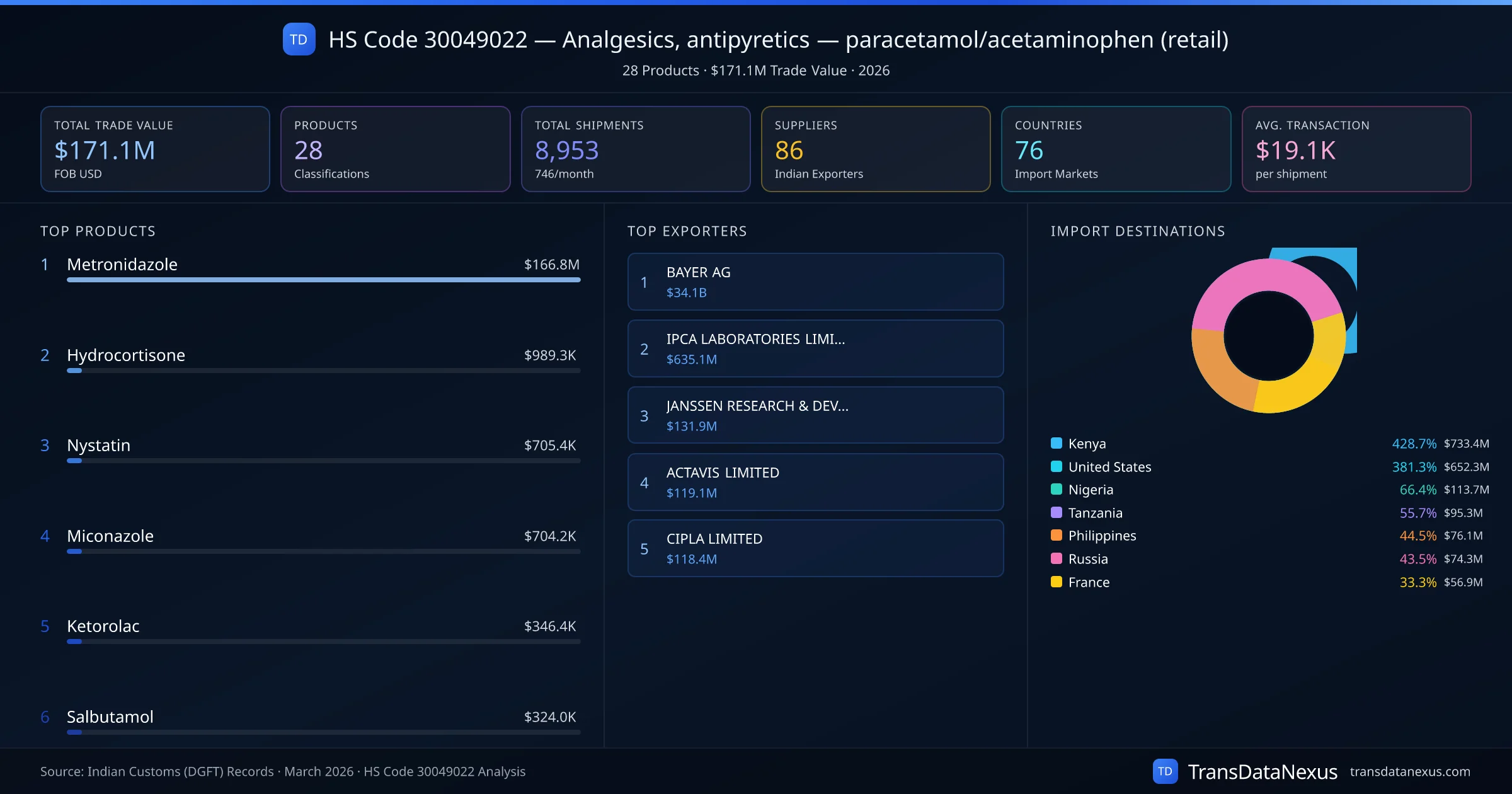 HS Code 30049022 (Analgesics, antipyretics โ paracetamol/acetaminophen (retail)) is one of India's most significant pharmaceutical export classifications under Chapter 30 of the Harmonized System. With a total trade value of $171.1M across 8,953 shipments, this code covers 28 distinct pharmaceutical products exported by 86 Indian manufacturers to 76 countries. The leading product under this classification is Metronidazole at $166.8M, followed by Hydrocortisone and Nystatin.