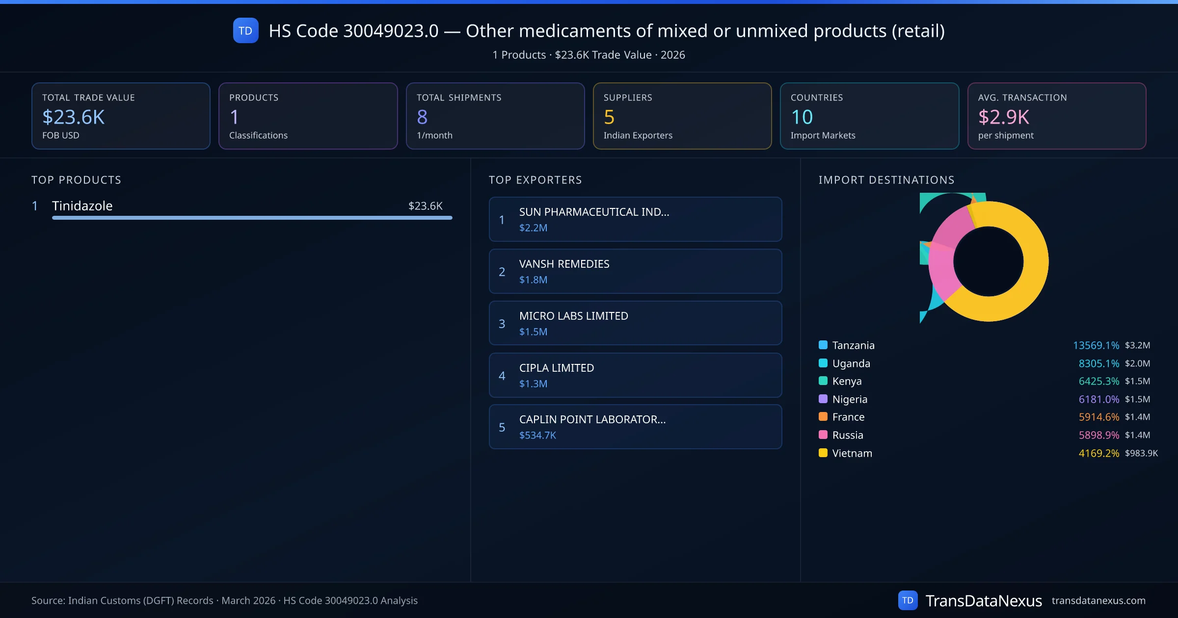 The top importing markets include Tanzania, Uganda, Kenya. The top 5 products account for 100.0% of total trade under this code. Average transaction value is $2.9K. Leading exporters include SUN PHARMACEUTICAL INDUSTRIES LIMITED and VANSH REMEDIES. Data sourced from Indian Customs (DGFT) shipping bill records.