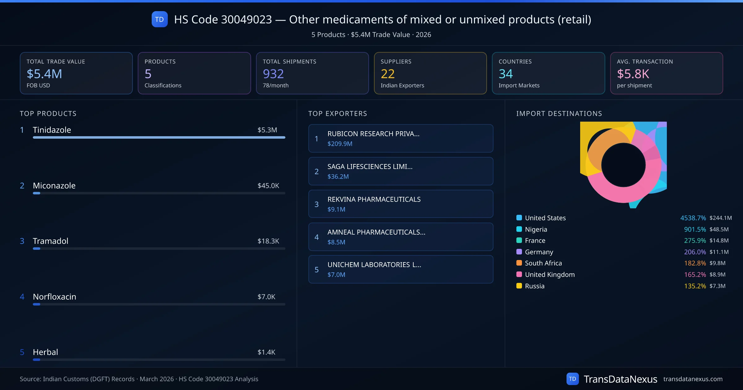 HS Code 30049023 (Other medicaments of mixed or unmixed products (retail)) is one of India's most significant pharmaceutical export classifications under Chapter 30 of the Harmonized System. With a total trade value of $5.4M across 932 shipments, this code covers 5 distinct pharmaceutical products exported by 22 Indian manufacturers to 34 countries. The leading product under this classification is Tinidazole at $5.3M, followed by Miconazole and Tramadol.