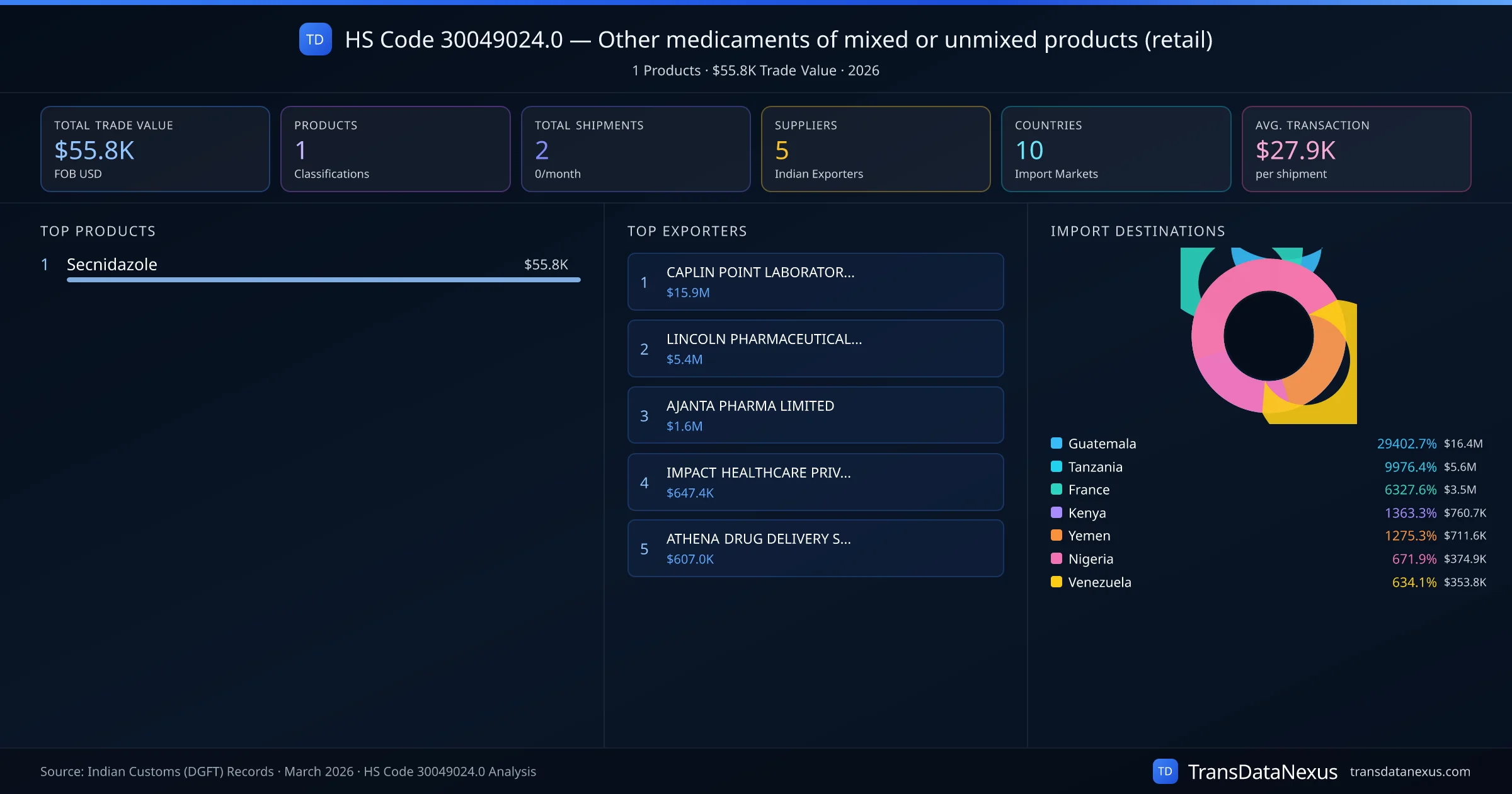 The top importing markets include Guatemala, Tanzania, France. The top 5 products account for 100.0% of total trade under this code. Average transaction value is $27.9K. Leading exporters include CAPLIN POINT LABORATORIES LIMITED and LINCOLN PHARMACEUTICALS LTD. Data sourced from Indian Customs (DGFT) shipping bill records.
