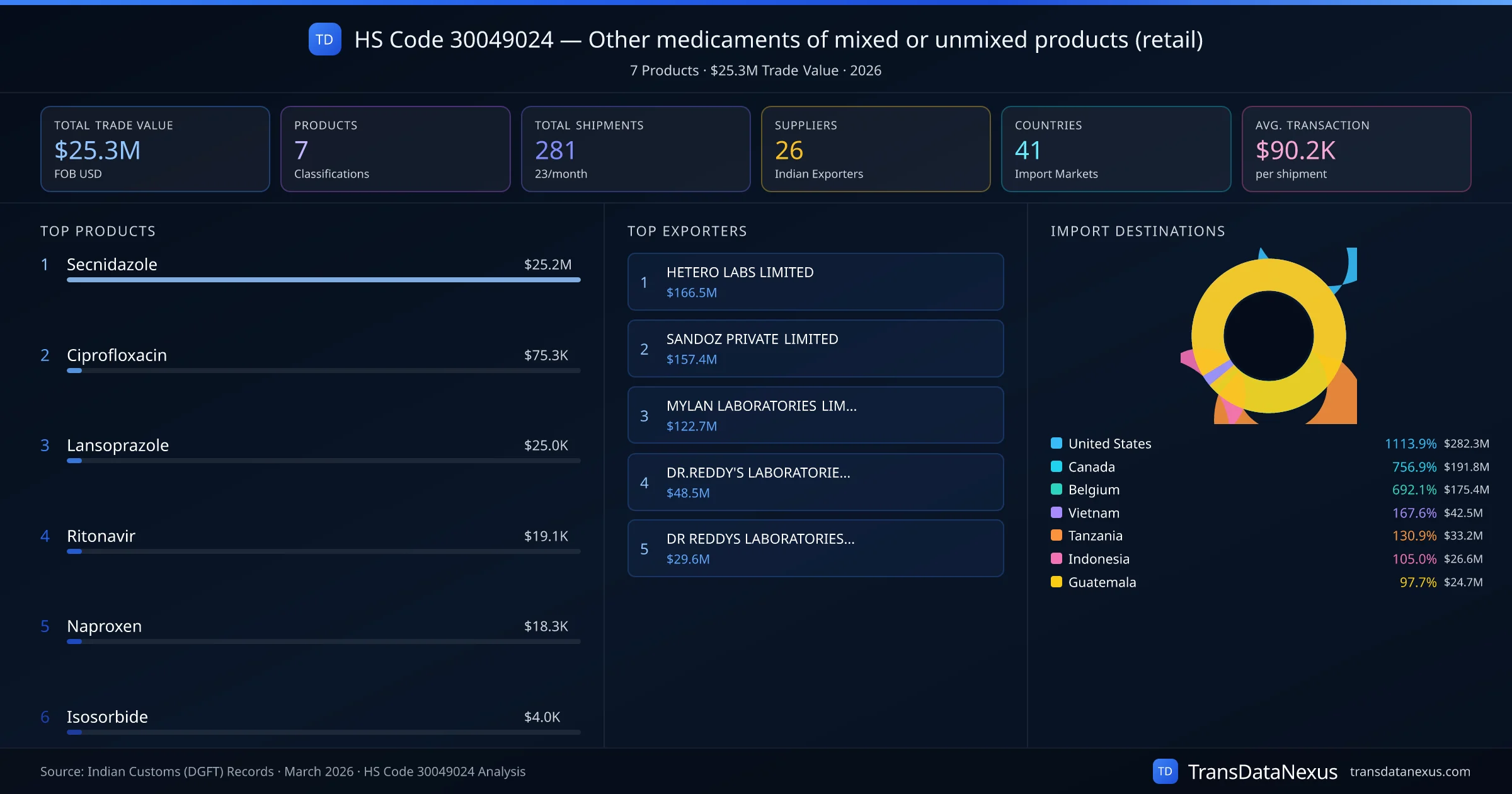 HS Code 30049024 (Other medicaments of mixed or unmixed products (retail)) is one of India's most significant pharmaceutical export classifications under Chapter 30 of the Harmonized System. With a total trade value of $25.3M across 281 shipments, this code covers 7 distinct pharmaceutical products exported by 26 Indian manufacturers to 41 countries. The leading product under this classification is Secnidazole at $25.2M, followed by Ciprofloxacin and Lansoprazole.