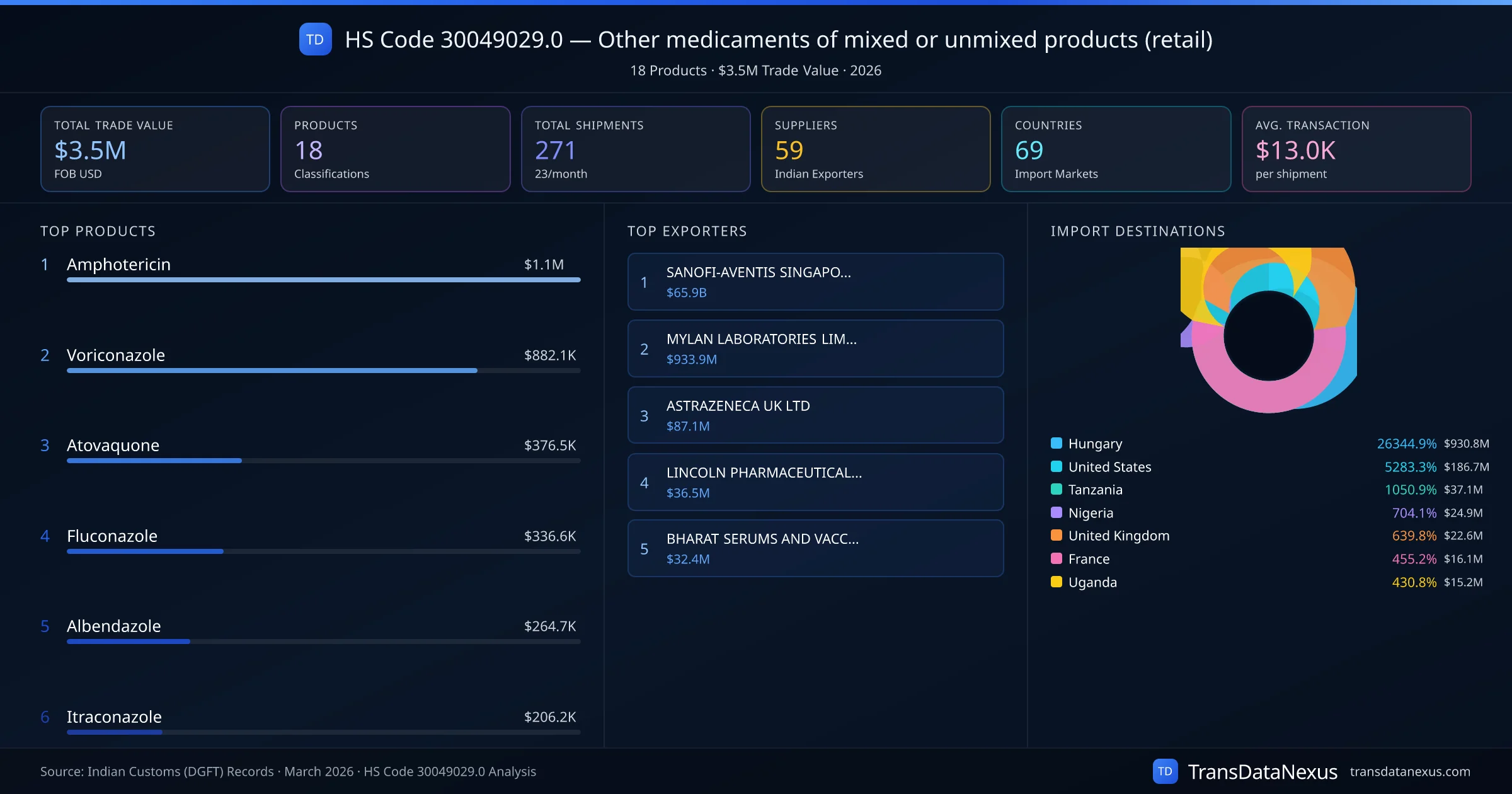 HS Code 30049029.0 (Other medicaments of mixed or unmixed products (retail)) is one of India's most significant pharmaceutical export classifications under Chapter 30 of the Harmonized System. With a total trade value of $3.5M across 271 shipments, this code covers 18 distinct pharmaceutical products exported by 59 Indian manufacturers to 69 countries. The leading product under this classification is Amphotericin at $1.1M, followed by Voriconazole and Atovaquone.