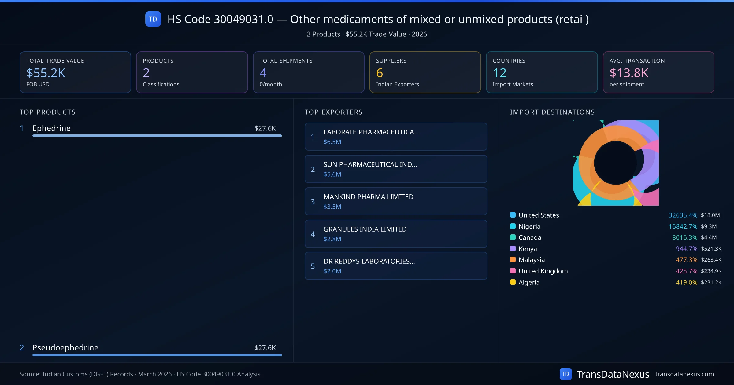 HS Code 30049031.0 (Other medicaments of mixed or unmixed products (retail)) is one of India's most significant pharmaceutical export classifications under Chapter 30 of the Harmonized System. With a total trade value of $55.2K across 4 shipments, this code covers 2 distinct pharmaceutical products exported by 6 Indian manufacturers to 12 countries. The leading product under this classification is Ephedrine at $27.6K, followed by Pseudoephedrine.