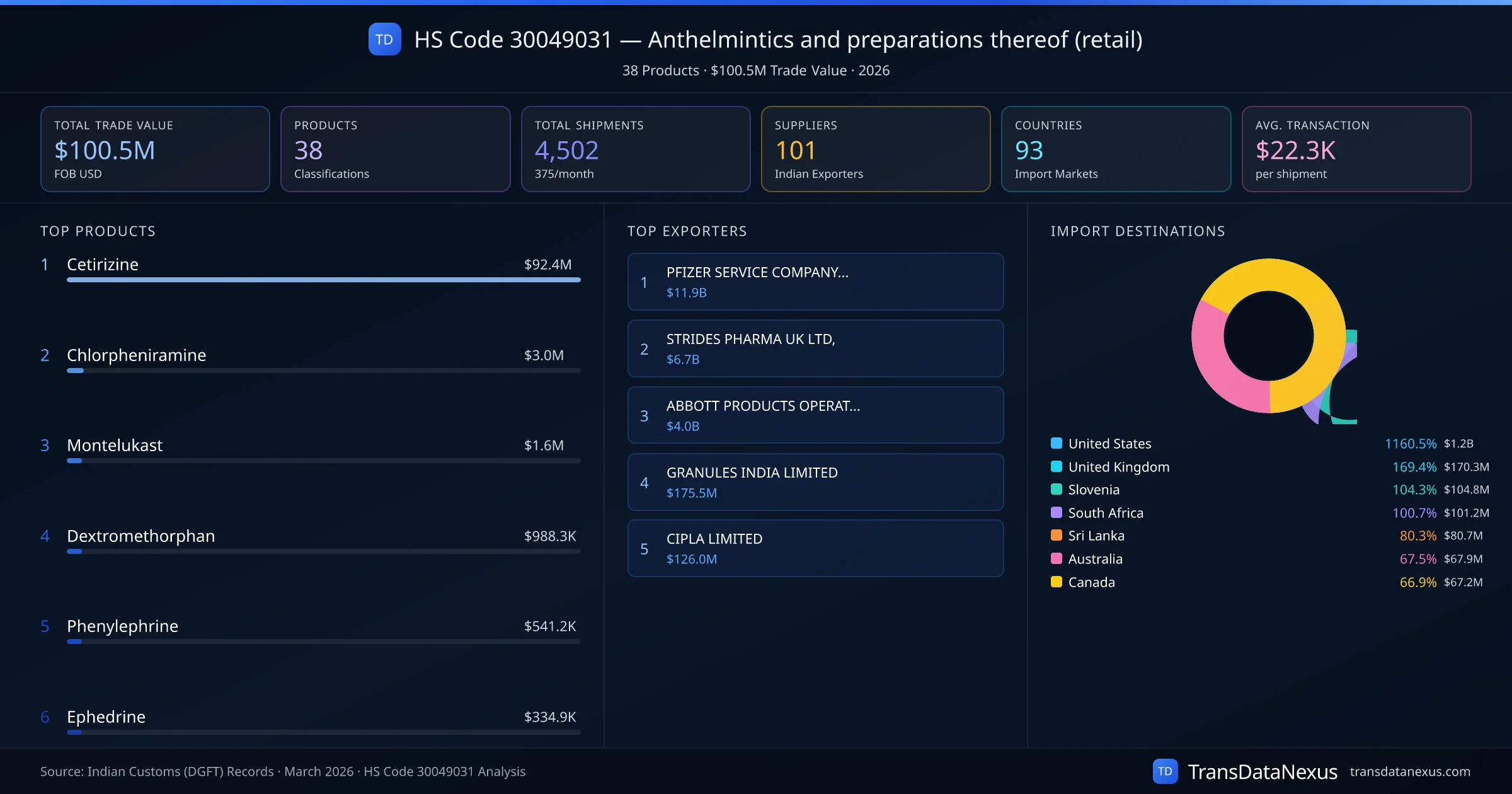 HS Code 30049031 (Anthelmintics and preparations thereof (retail)) is one of India's most significant pharmaceutical export classifications under Chapter 30 of the Harmonized System. With a total trade value of $100.5M across 4,502 shipments, this code covers 38 distinct pharmaceutical products exported by 101 Indian manufacturers to 93 countries. The leading product under this classification is Cetirizine at $92.4M, followed by Chlorpheniramine and Montelukast.