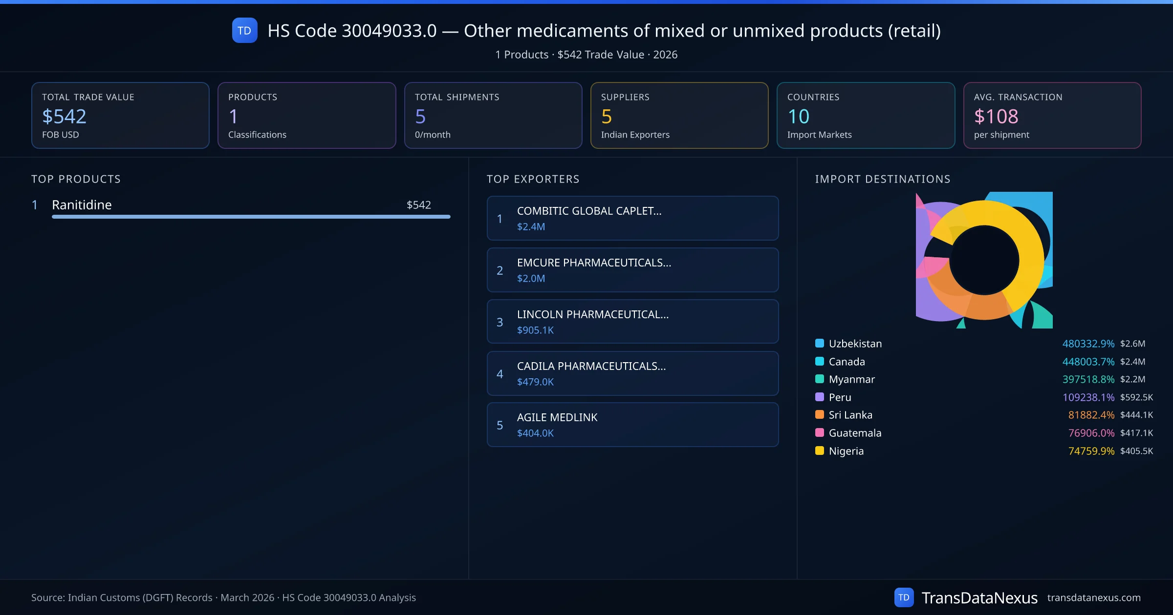 The top importing markets include Uzbekistan, Canada, Myanmar. The top 5 products account for 100.0% of total trade under this code. Average transaction value is $108. Leading exporters include COMBITIC GLOBAL CAPLET PRIVATE LIMITED and EMCURE PHARMACEUTICALS LIMITED. Data sourced from Indian Customs (DGFT) shipping bill records.