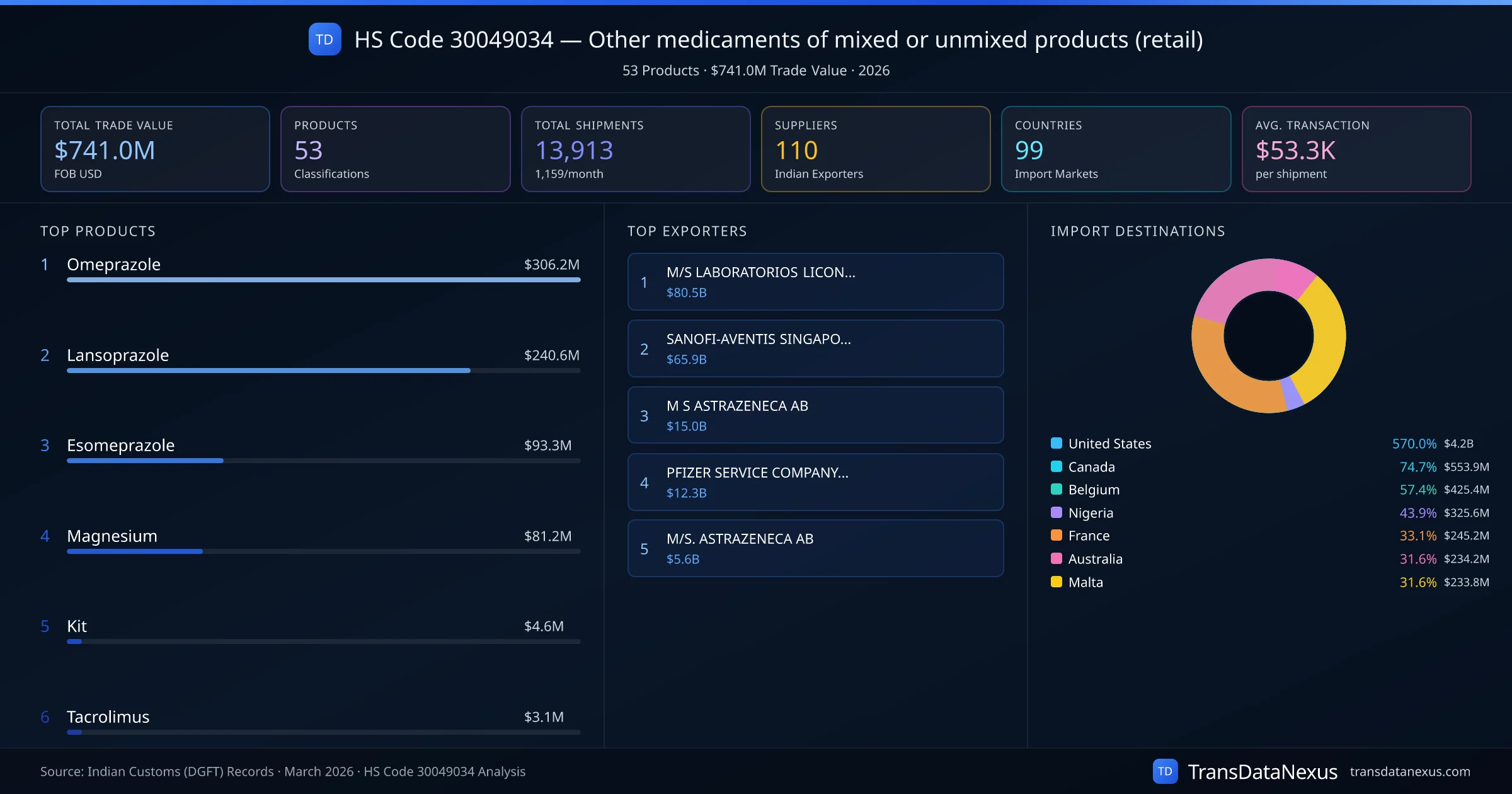HS Code 30049034 (Other medicaments of mixed or unmixed products (retail)) is one of India's most significant pharmaceutical export classifications under Chapter 30 of the Harmonized System. With a total trade value of $741.0M across 13,913 shipments, this code covers 53 distinct pharmaceutical products exported by 110 Indian manufacturers to 99 countries. The leading product under this classification is Omeprazole at $306.2M, followed by Lansoprazole and Esomeprazole.