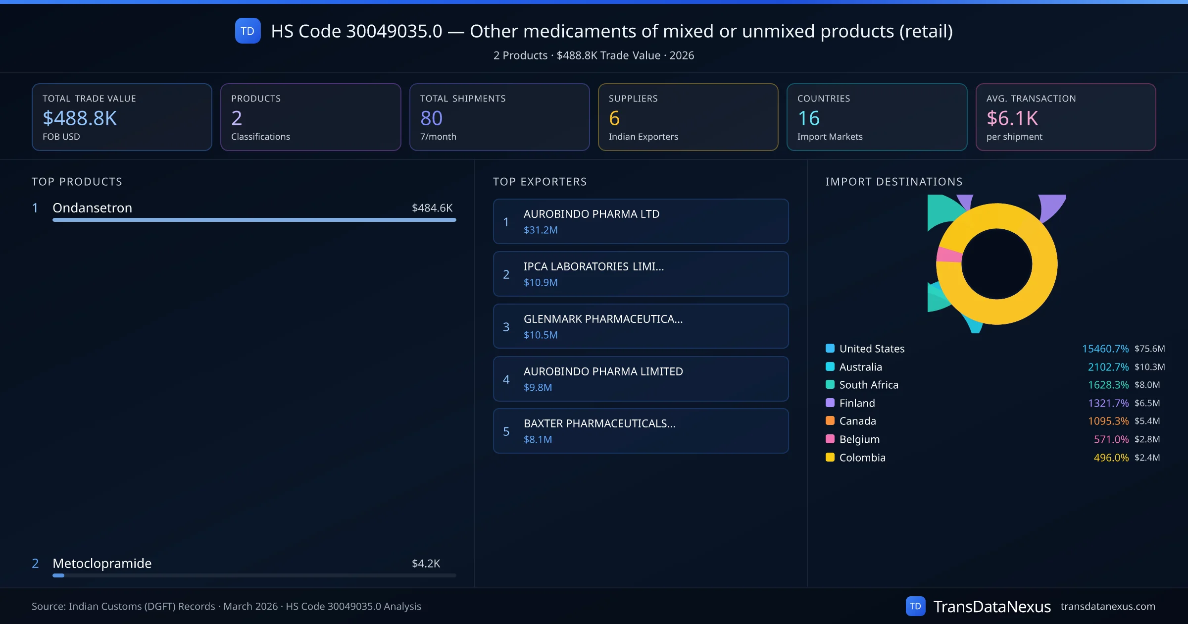 HS Code 30049035.0 (Other medicaments of mixed or unmixed products (retail)) is one of India's most significant pharmaceutical export classifications under Chapter 30 of the Harmonized System. With a total trade value of $488.8K across 80 shipments, this code covers 2 distinct pharmaceutical products exported by 6 Indian manufacturers to 16 countries. The leading product under this classification is Ondansetron at $484.6K, followed by Metoclopramide.