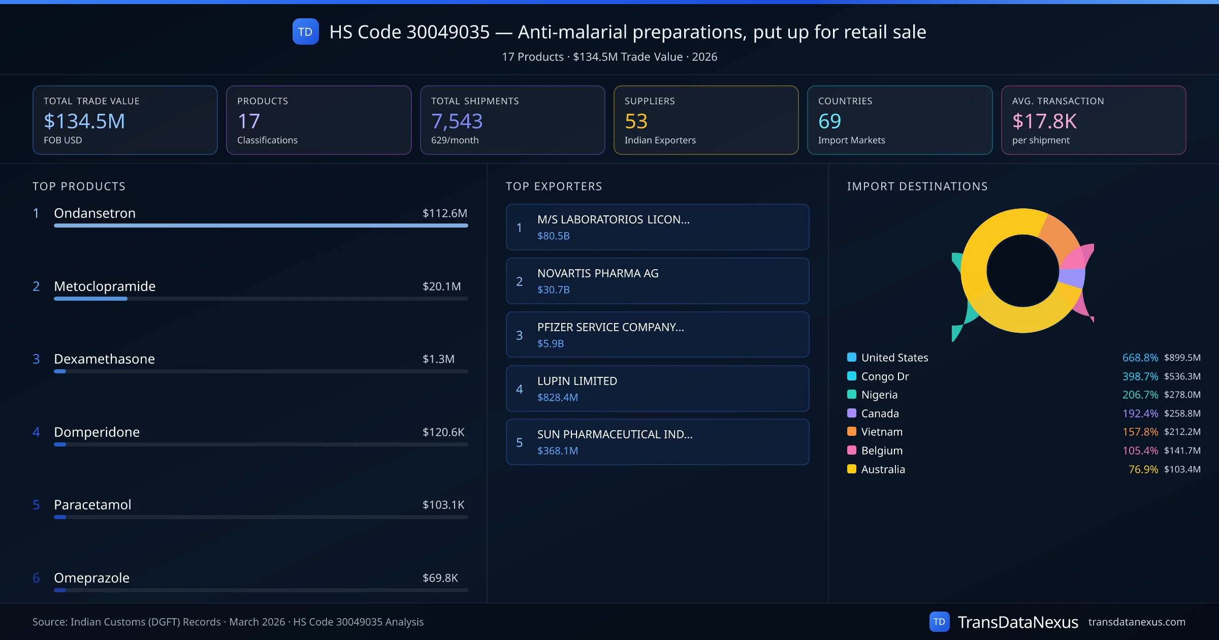 HS Code 30049035 (Anti-malarial preparations, put up for retail sale) is one of India's most significant pharmaceutical export classifications under Chapter 30 of the Harmonized System. With a total trade value of $134.5M across 7,543 shipments, this code covers 17 distinct pharmaceutical products exported by 53 Indian manufacturers to 69 countries. The leading product under this classification is Ondansetron at $112.6M, followed by Metoclopramide and Dexamethasone.