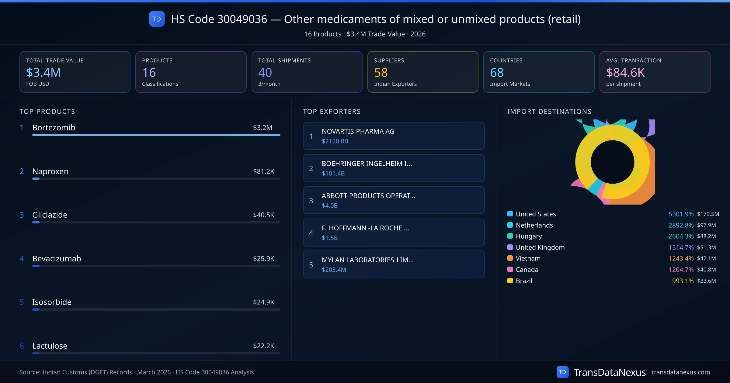 HS Code 30049036 (Other medicaments of mixed or unmixed products (retail)) is one of India's most significant pharmaceutical export classifications under Chapter 30 of the Harmonized System. With a total trade value of $3.4M across 40 shipments, this code covers 16 distinct pharmaceutical products exported by 58 Indian manufacturers to 68 countries. The leading product under this classification is Bortezomib at $3.2M, followed by Naproxen and Gliclazide.