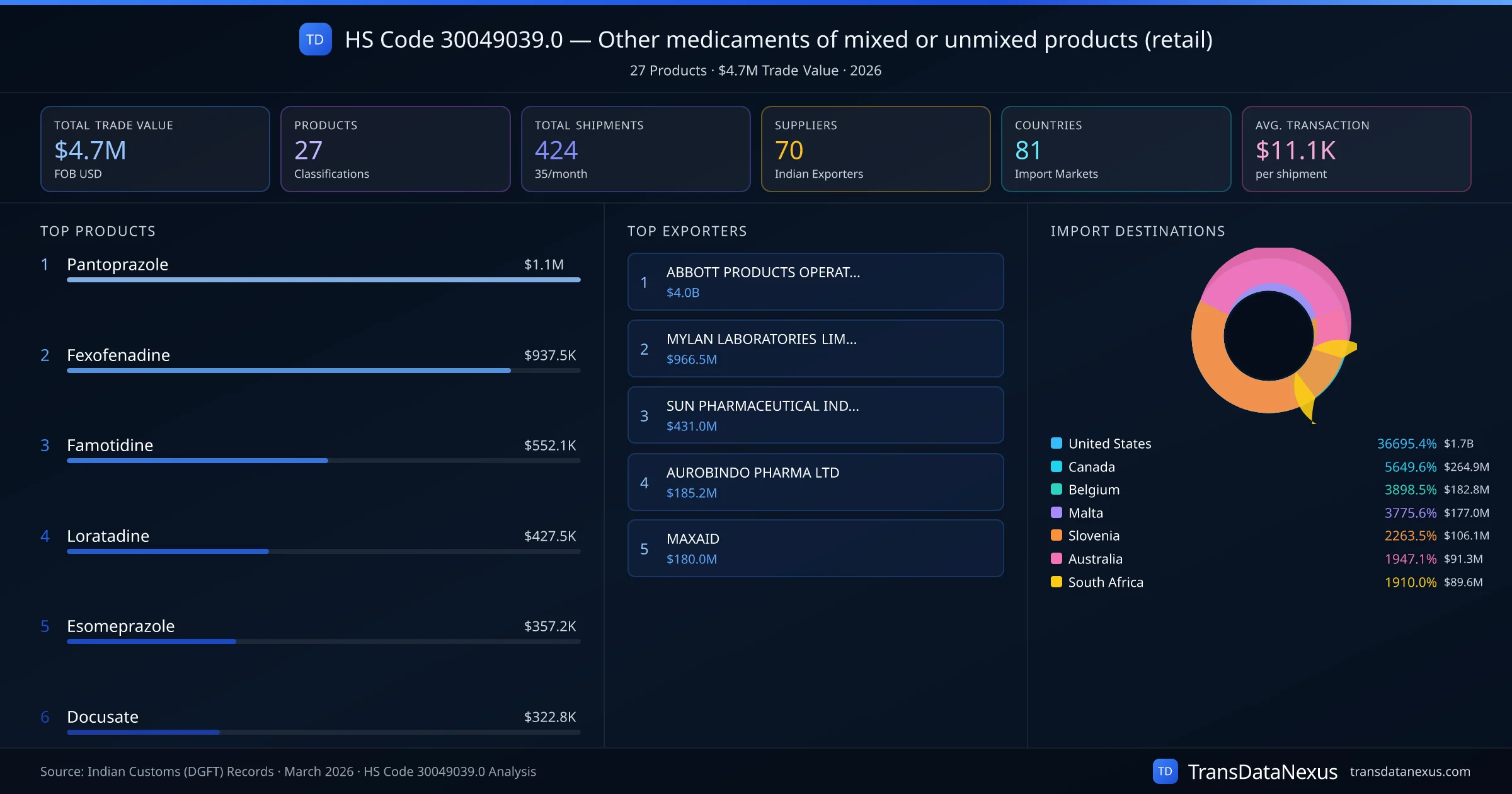 The top importing markets include United States, Canada, Belgium. The top 5 products account for 71.6% of total trade under this code. Average transaction value is $11.1K. Leading exporters include ABBOTT PRODUCTS OPERATIONS AG and MYLAN LABORATORIES LIMITED. Data sourced from Indian Customs (DGFT) shipping bill records.