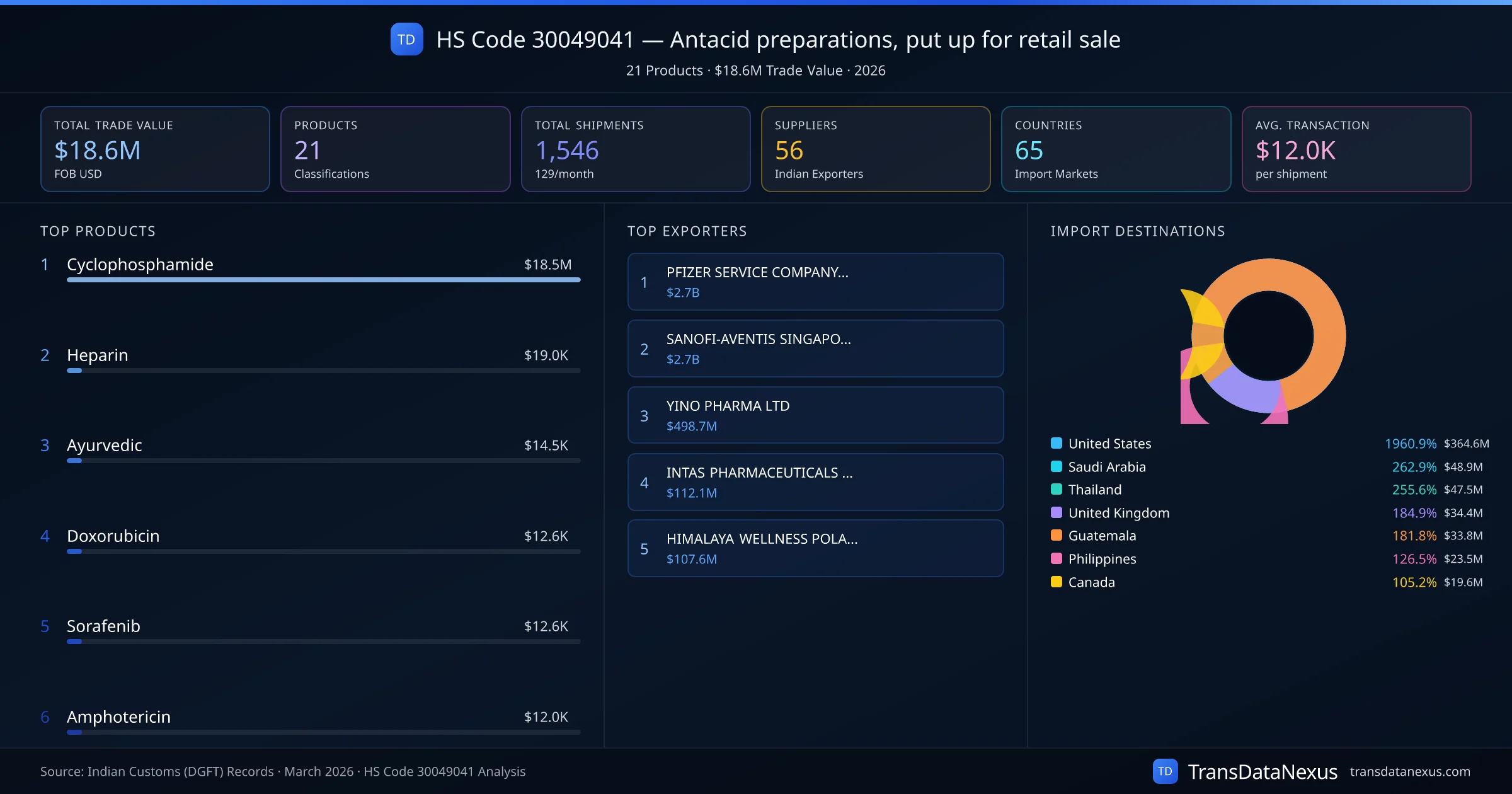 HS Code 30049041 (Antacid preparations, put up for retail sale) is one of India's most significant pharmaceutical export classifications under Chapter 30 of the Harmonized System. With a total trade value of $18.6M across 1,546 shipments, this code covers 21 distinct pharmaceutical products exported by 56 Indian manufacturers to 65 countries. The leading product under this classification is Cyclophosphamide at $18.5M, followed by Heparin and Ayurvedic.
