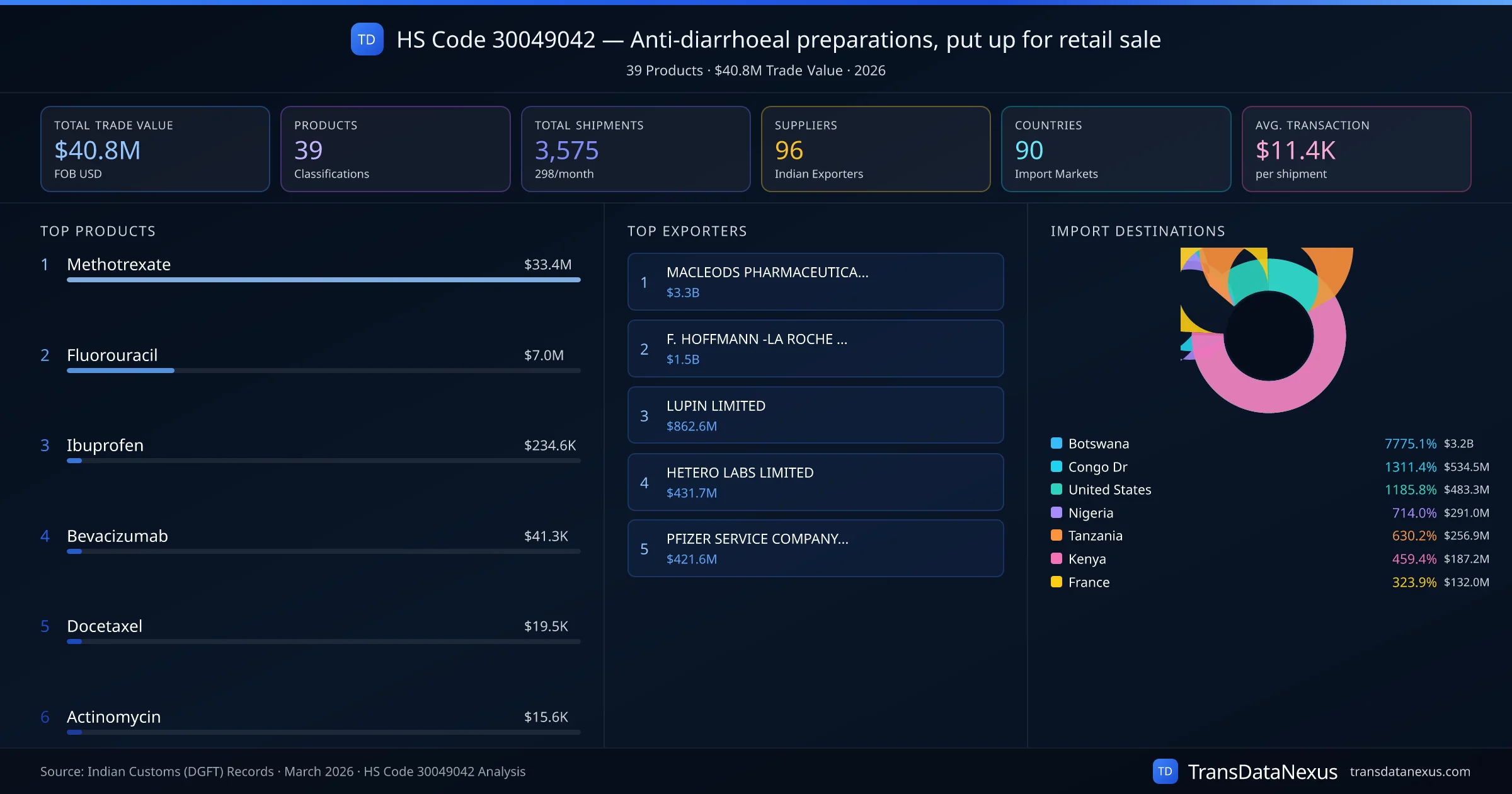 The top importing markets include Botswana, Congo Dr, United States. The top 5 products account for 99.8% of total trade under this code. Average transaction value is $11.4K. Leading exporters include MACLEODS PHARMACEUTICALS LTD and F. HOFFMANN -LA ROCHE LTD. Data sourced from Indian Customs (DGFT) shipping bill records.