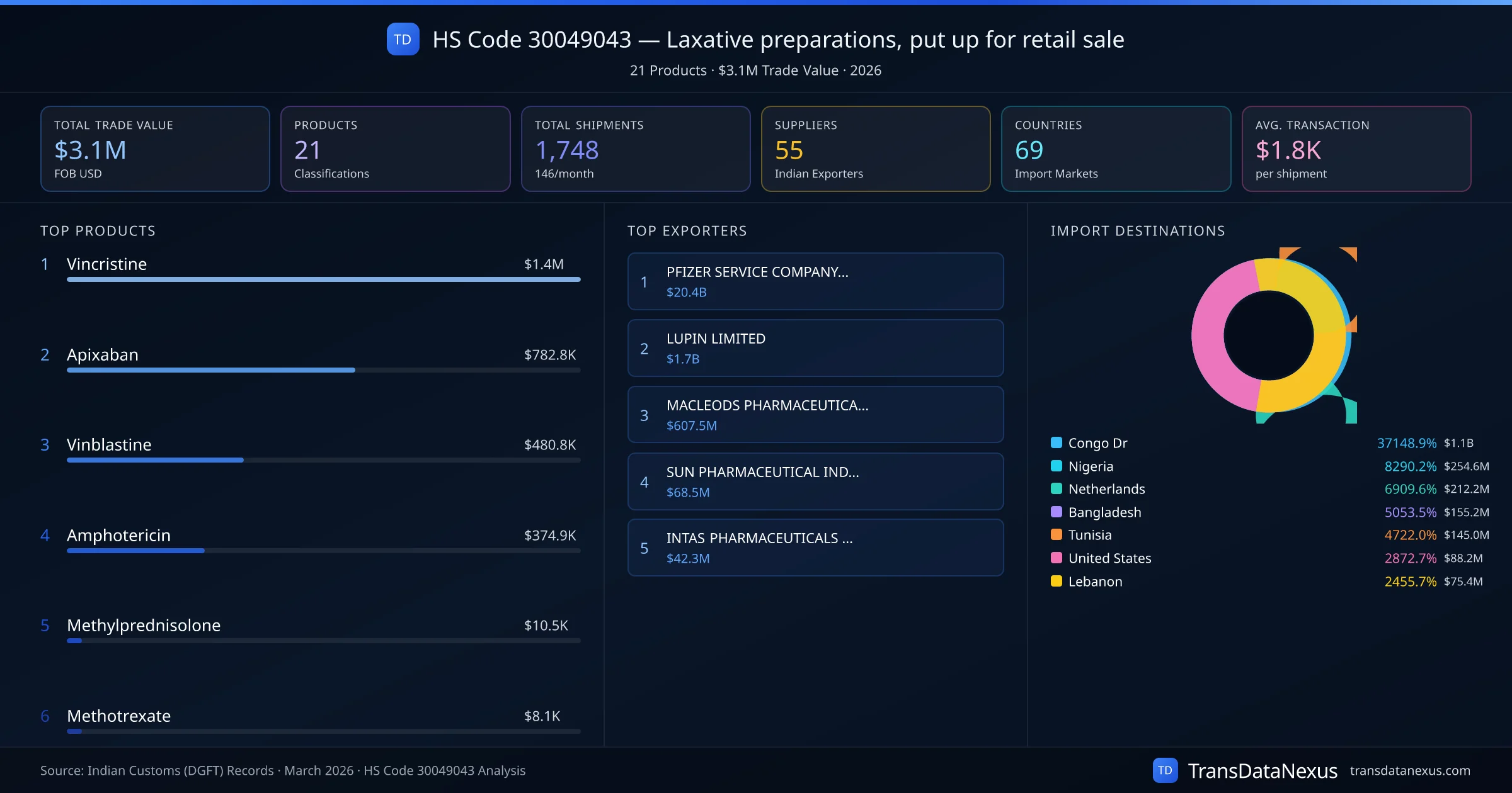 HS Code 30049043 (Laxative preparations, put up for retail sale) is one of India's most significant pharmaceutical export classifications under Chapter 30 of the Harmonized System. With a total trade value of $3.1M across 1,748 shipments, this code covers 21 distinct pharmaceutical products exported by 55 Indian manufacturers to 69 countries. The leading product under this classification is Vincristine at $1.4M, followed by Apixaban and Vinblastine.