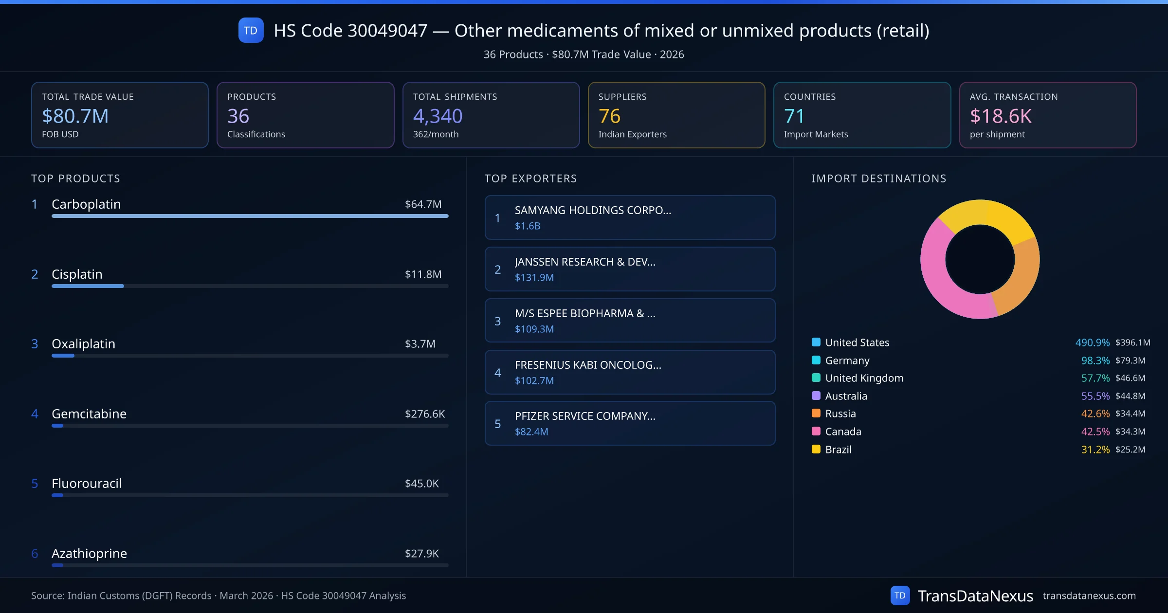 HS Code 30049047 (Other medicaments of mixed or unmixed products (retail)) is one of India's most significant pharmaceutical export classifications under Chapter 30 of the Harmonized System. With a total trade value of $80.7M across 4,340 shipments, this code covers 36 distinct pharmaceutical products exported by 76 Indian manufacturers to 71 countries. The leading product under this classification is Carboplatin at $64.7M, followed by Cisplatin and Oxaliplatin.