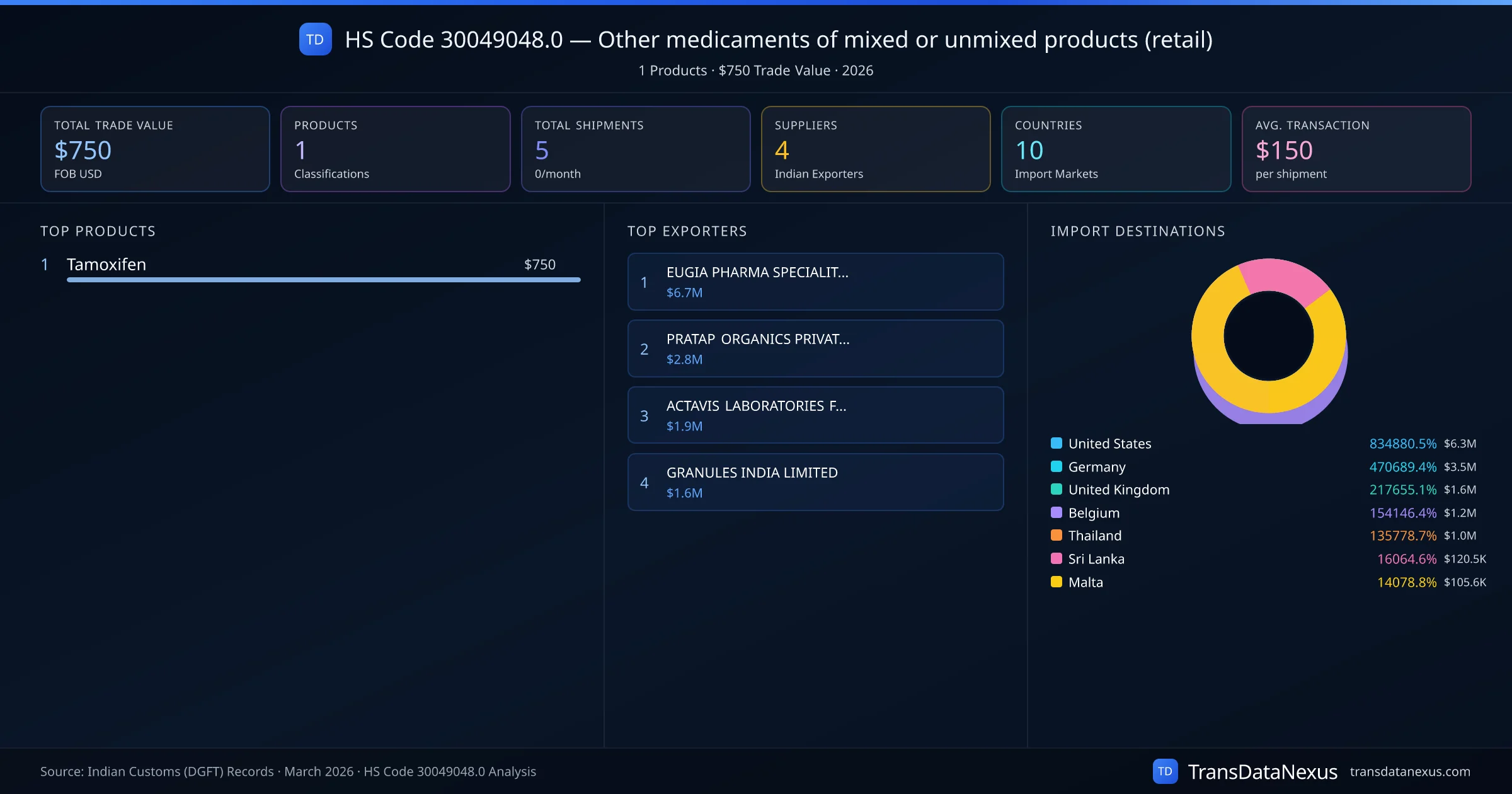 HS Code 30049048.0 (Other medicaments of mixed or unmixed products (retail)) is one of India's most significant pharmaceutical export classifications under Chapter 30 of the Harmonized System. With a total trade value of $750 across 5 shipments, this code covers 1 distinct pharmaceutical products exported by 4 Indian manufacturers to 10 countries. The leading product under this classification is Tamoxifen at $750, followed by .